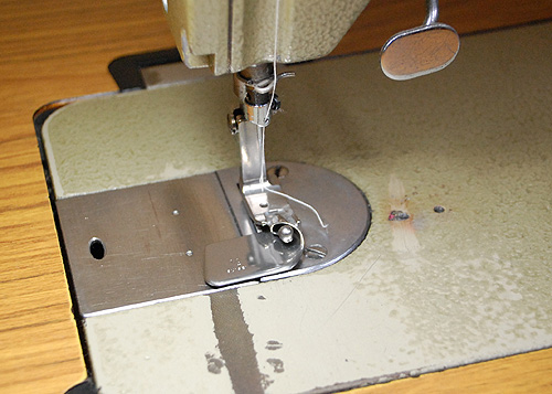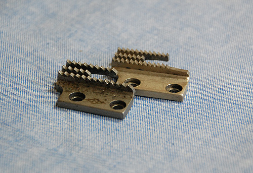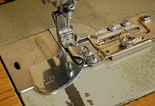 それを、折り山側を縫うが為には、押さえ金も、送り歯も、すべて当たる部分を切ったものを使わなければなりません。