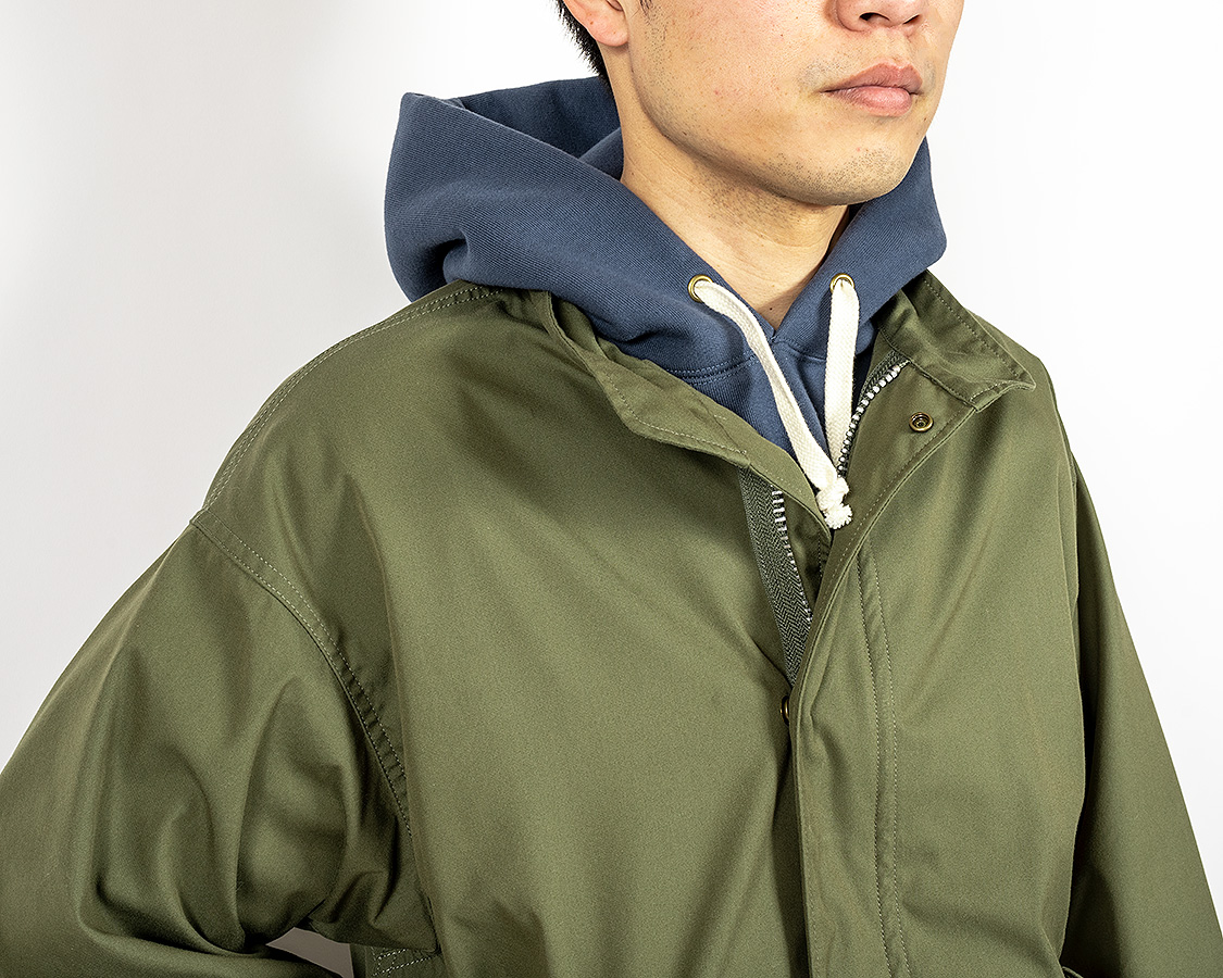 M-65、フィッシュテールの特徴。襟が台襟。ミリタリーでは着脱式のフードがつきますが、WORKERS版は割り切ってフードはつきません。というのも・・・