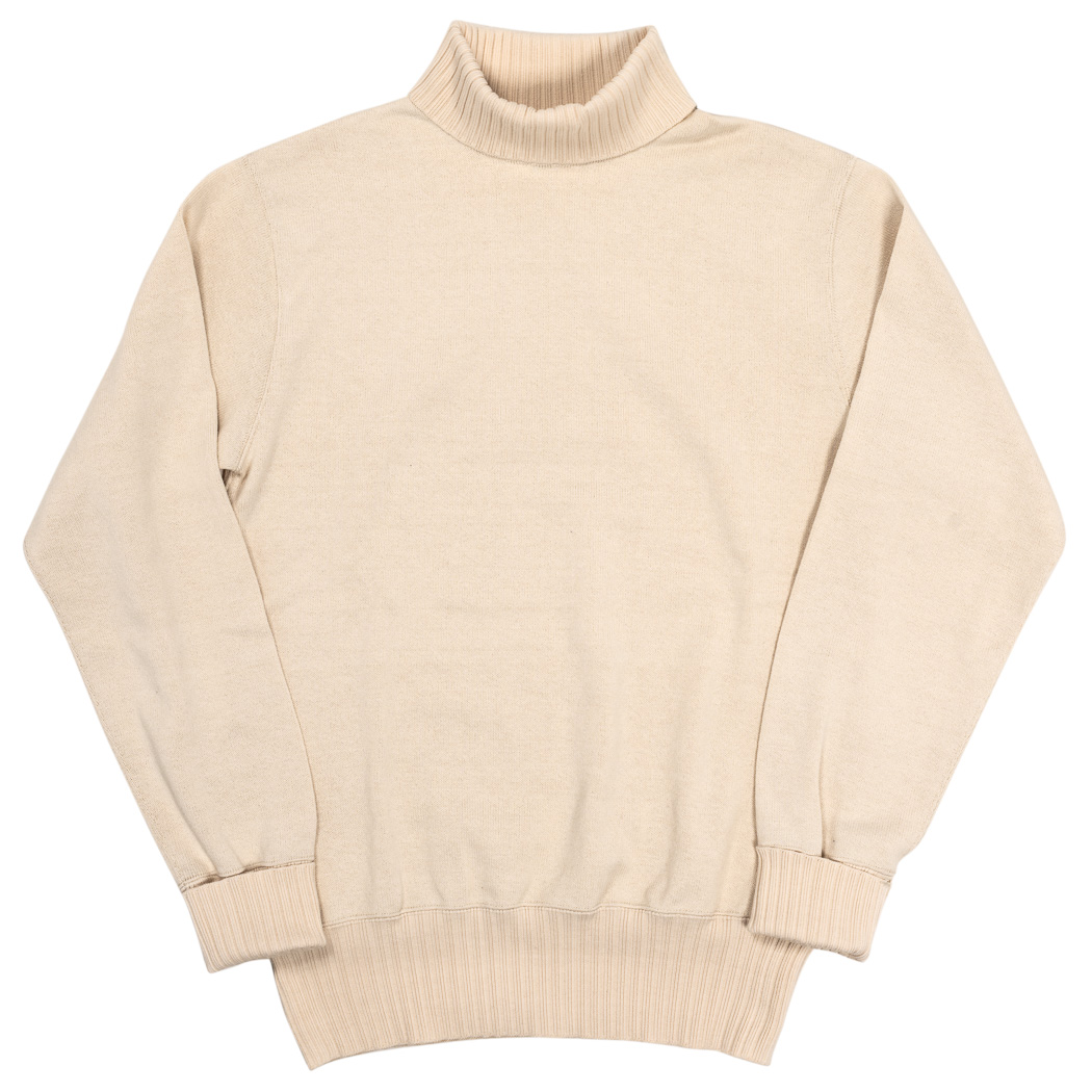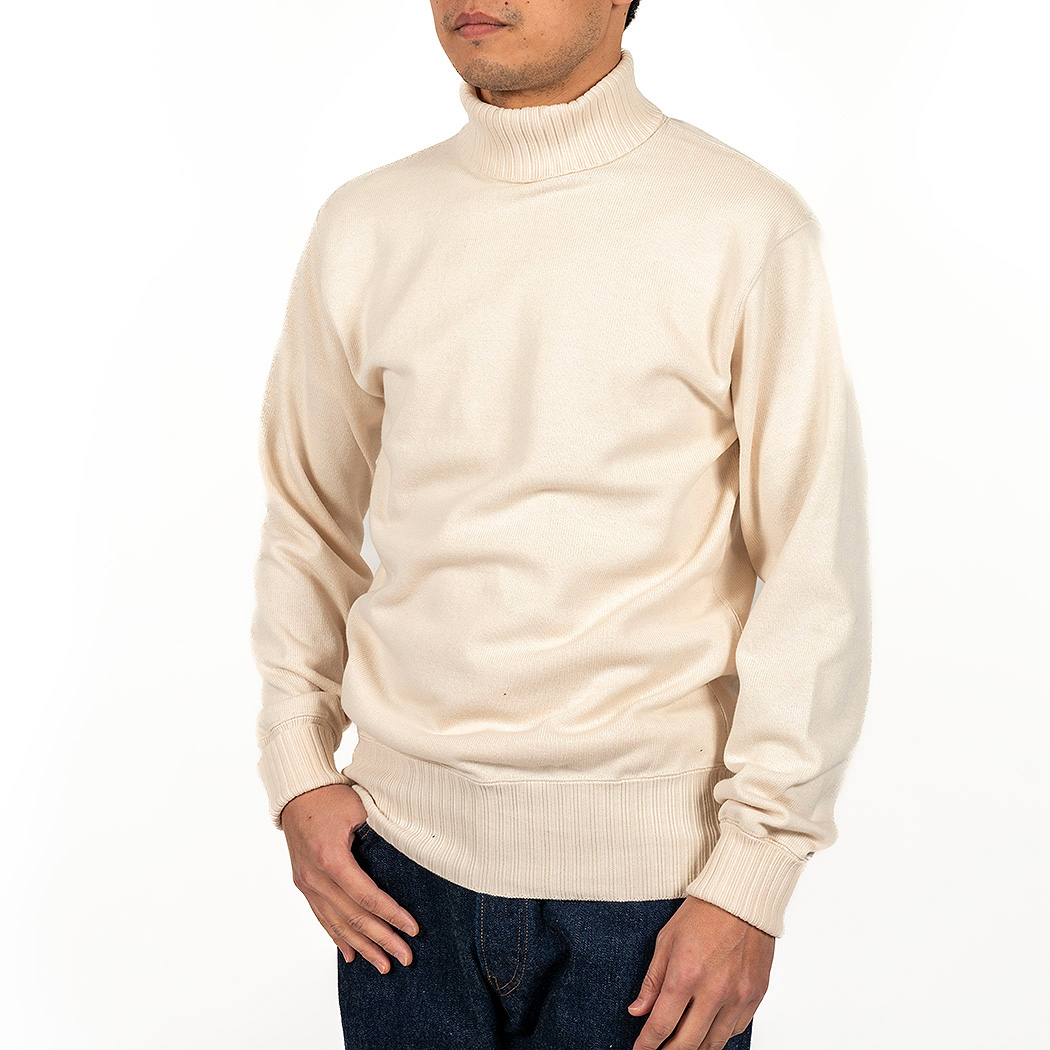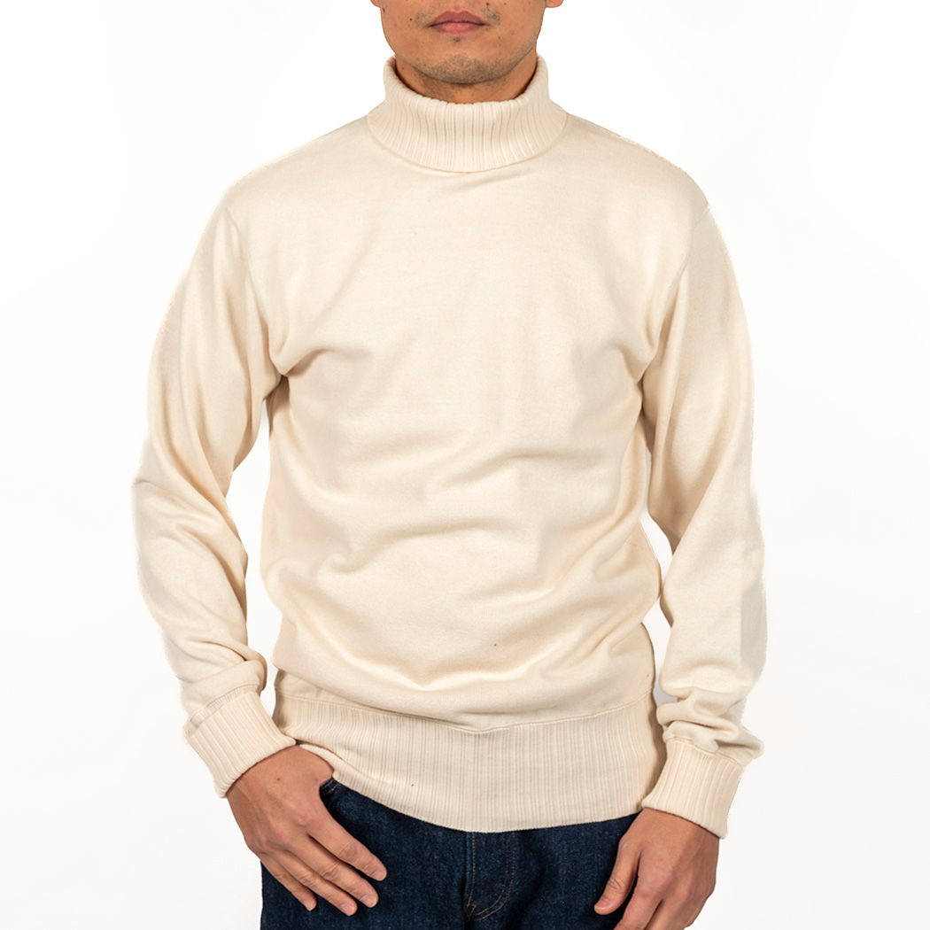 RAF Sweater、イメージは映画ダンケルグのRAF パイロットが着ていたハイネック。中はT シャツ一枚で着るとセーターの起毛面が肌に触れて気持ちいい。