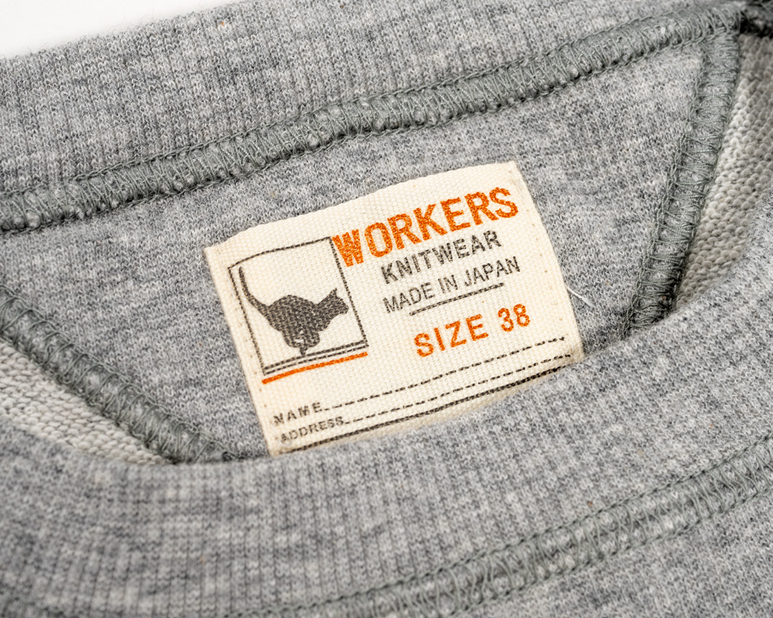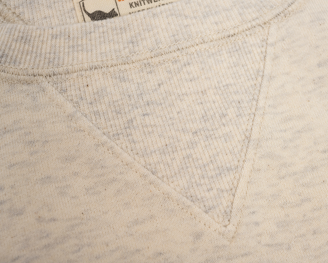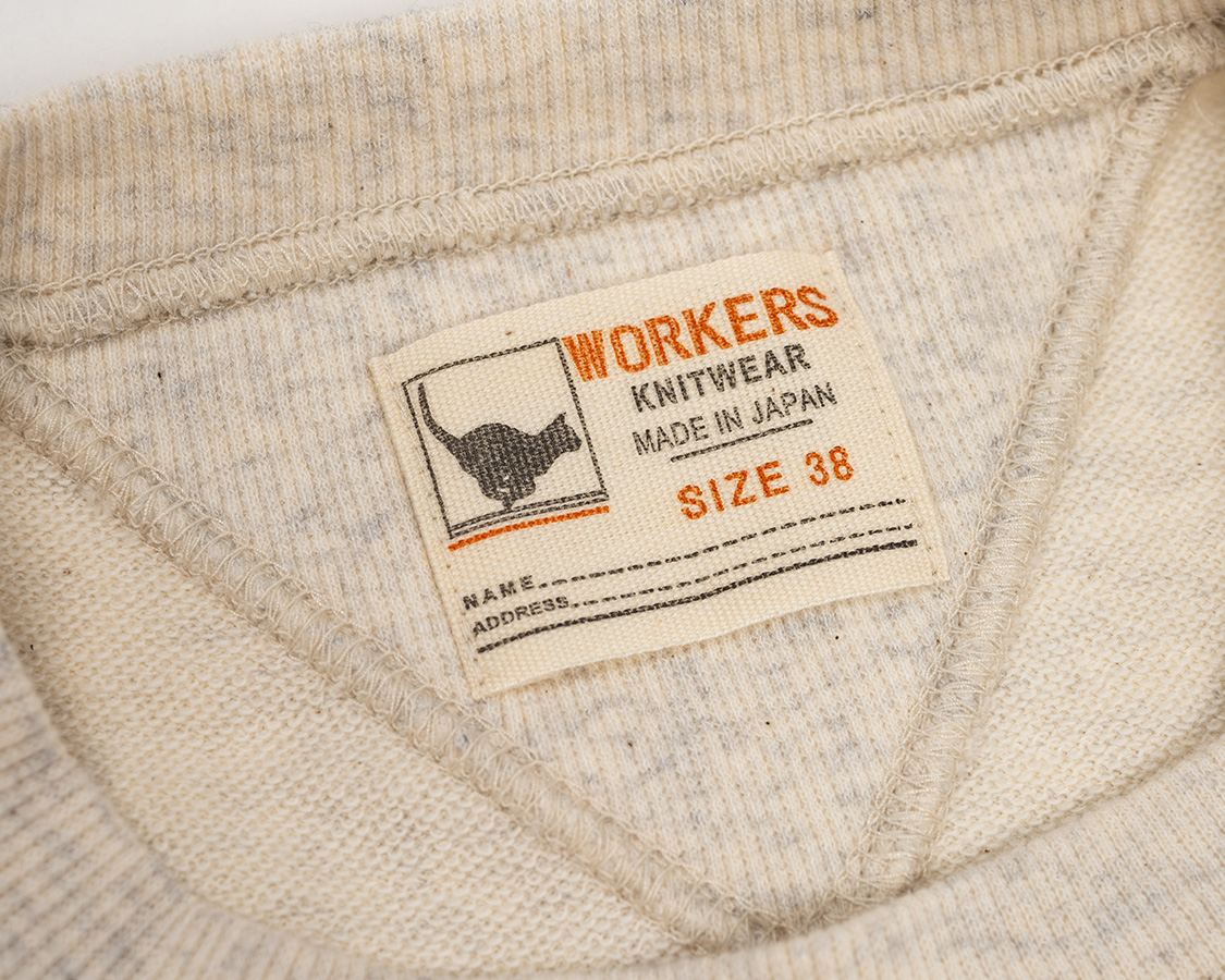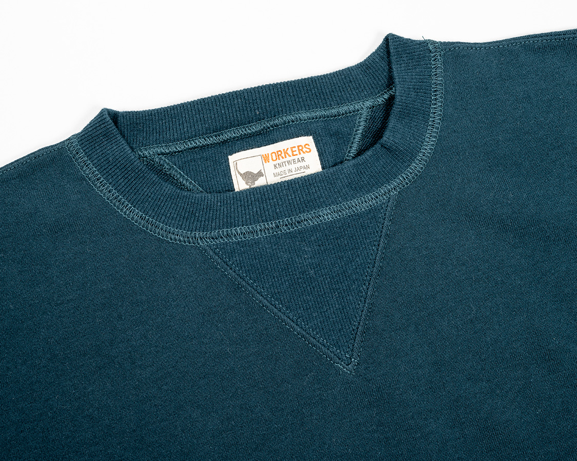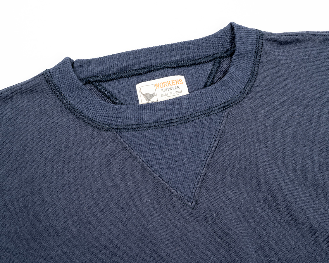 それに対し、首回りは表・裏ともにロック目の見える縫い方。 「両面振り」という縫い方。