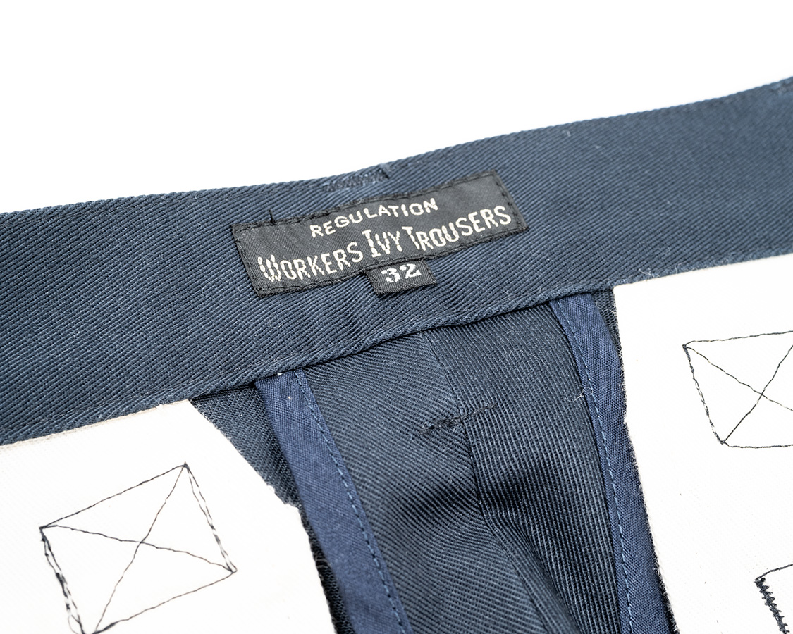 後ろ中心ネーム。IVY PANTSにしてしまおうかと思いましたが、一応ここはTROUSERSで。後ろ中心の割りもパイピング始末。