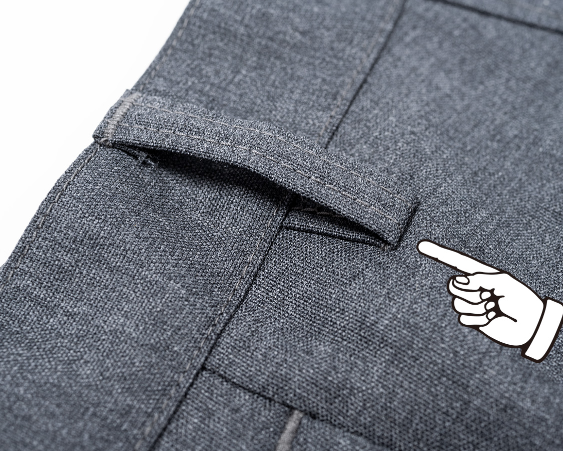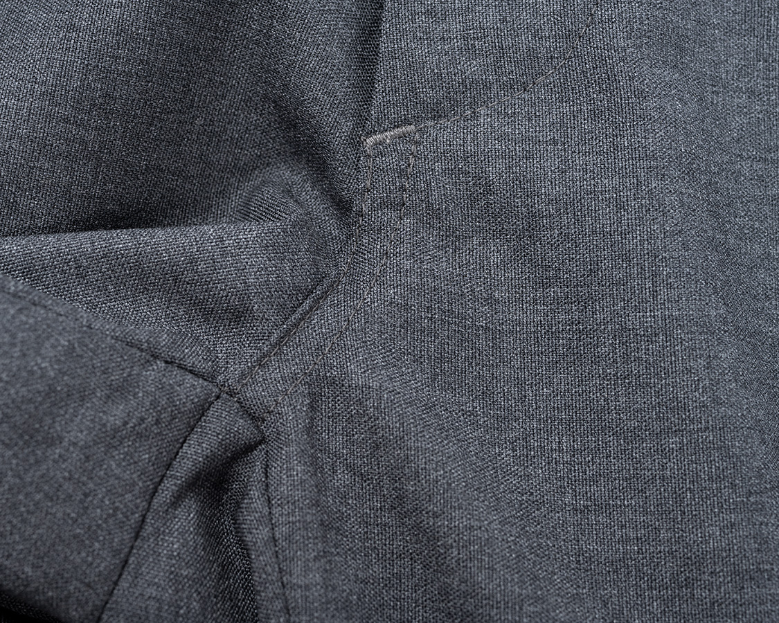 小股。開きどまりから下。ドレスウェア的にはステッチを入れない始末が多いのですが、あえてジーンズのようにダブルステッチ。強度優先です。