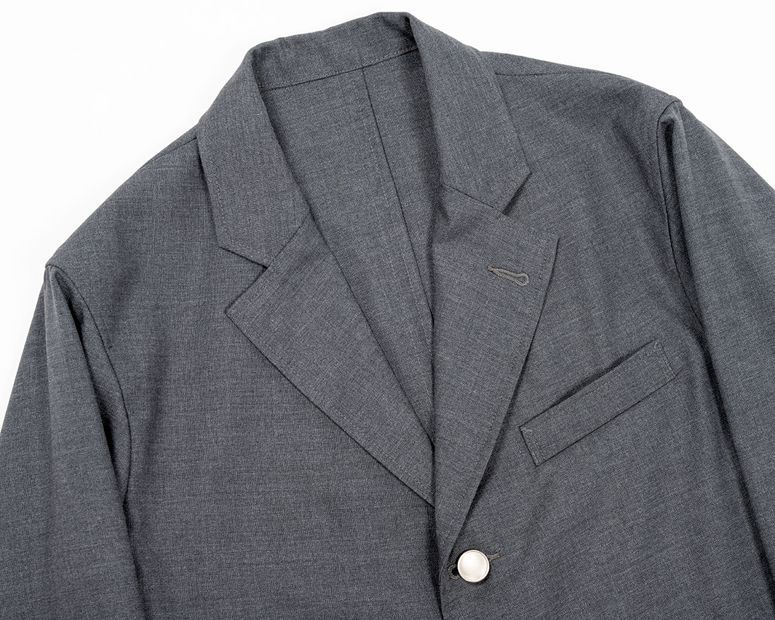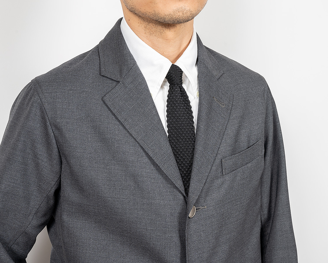 大きすぎず、小さすぎずのラペル。ゴージー線の切り替えも高くも・低くもなく。今の「中庸」を目指したラペル周り。
