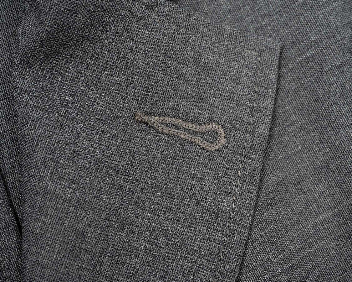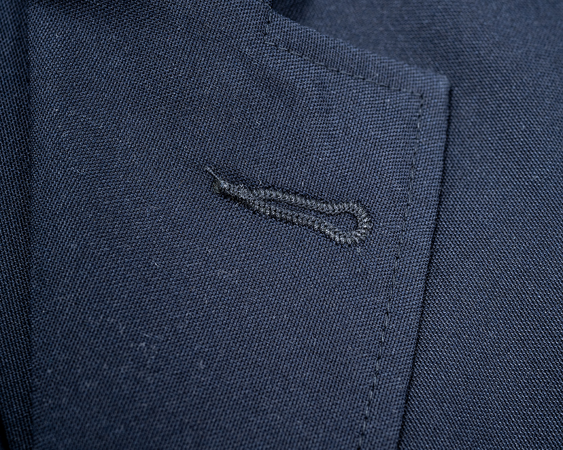 「いや、俺はどうしてもフラワーを飾って、フラスコもつけたい!」という方はメスを入れて、ラペル裏にフラスコを引っ掛ける紐ループをご自分でつけてください。近所のお直し屋さんに頼むと「何言ってるんだ?」と成りそうなので、どこかに依頼するならテーラーさんに頼んでください。
