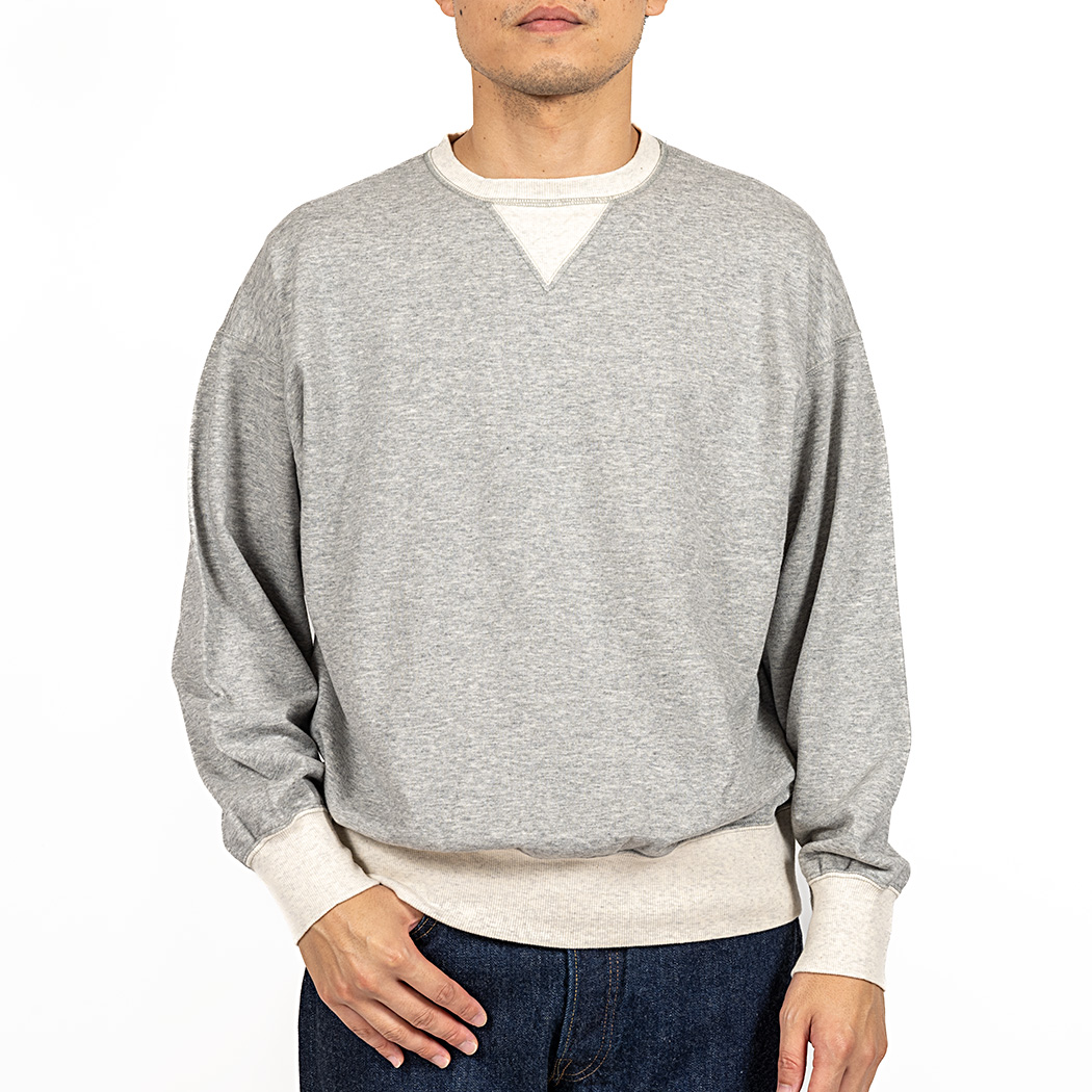 真冬以外の時期、インナーとしても着やすい厚みで作りたいと、8 オンス・起毛しない裏毛(スウェット素材)でラインナップ。春スウェットは作っても売れないのに、自分が着たいとどうしても形にしたくなる。服好きがメーカーやるもんじゃ ないという良い例です。