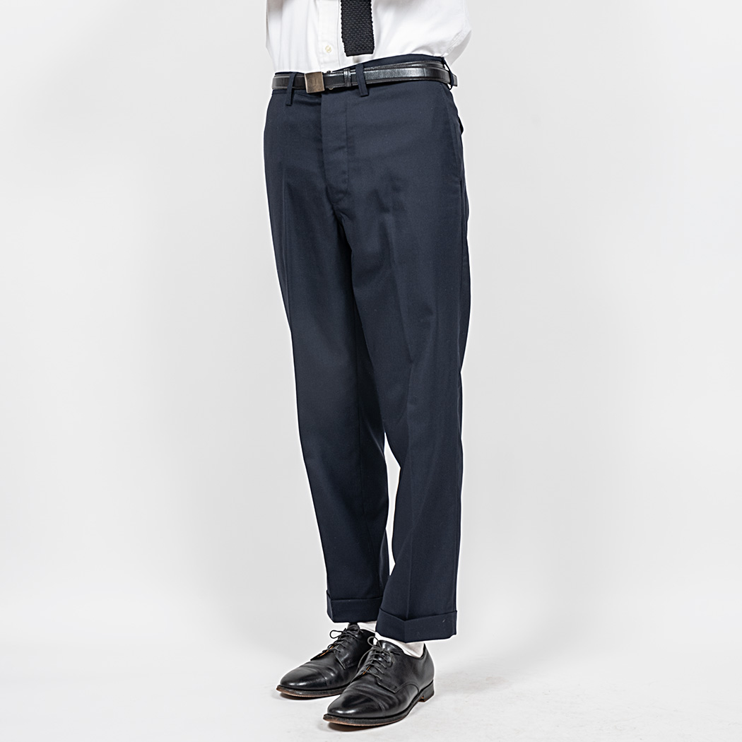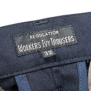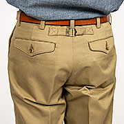 裾幅19 センチ程のやりすぎないスリムフィット。プレインフロント(前にタック無)、サイドの縫い目利用ポケット。バックシンチにフラップ付き玉縁ポケット。これでもかと「アイビー」らしい仕様を盛り込みました。