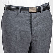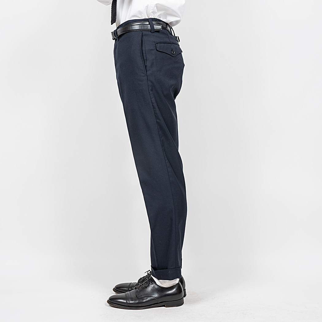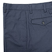 素材、ネイビー/ グレイのコンバットウールトロピカル。名前がちょっと・・・ですが、ウールにコーデュラナイロン/ ポリエステルを混紡。材料の段階で混ぜ込んで、薄手の平織り・トロピカルに織る。結果、摩耗に非常に強い。皺にもなりにくい。ただ高い! 6.2 オンスなので夏場のスラックスには最適な厚み。