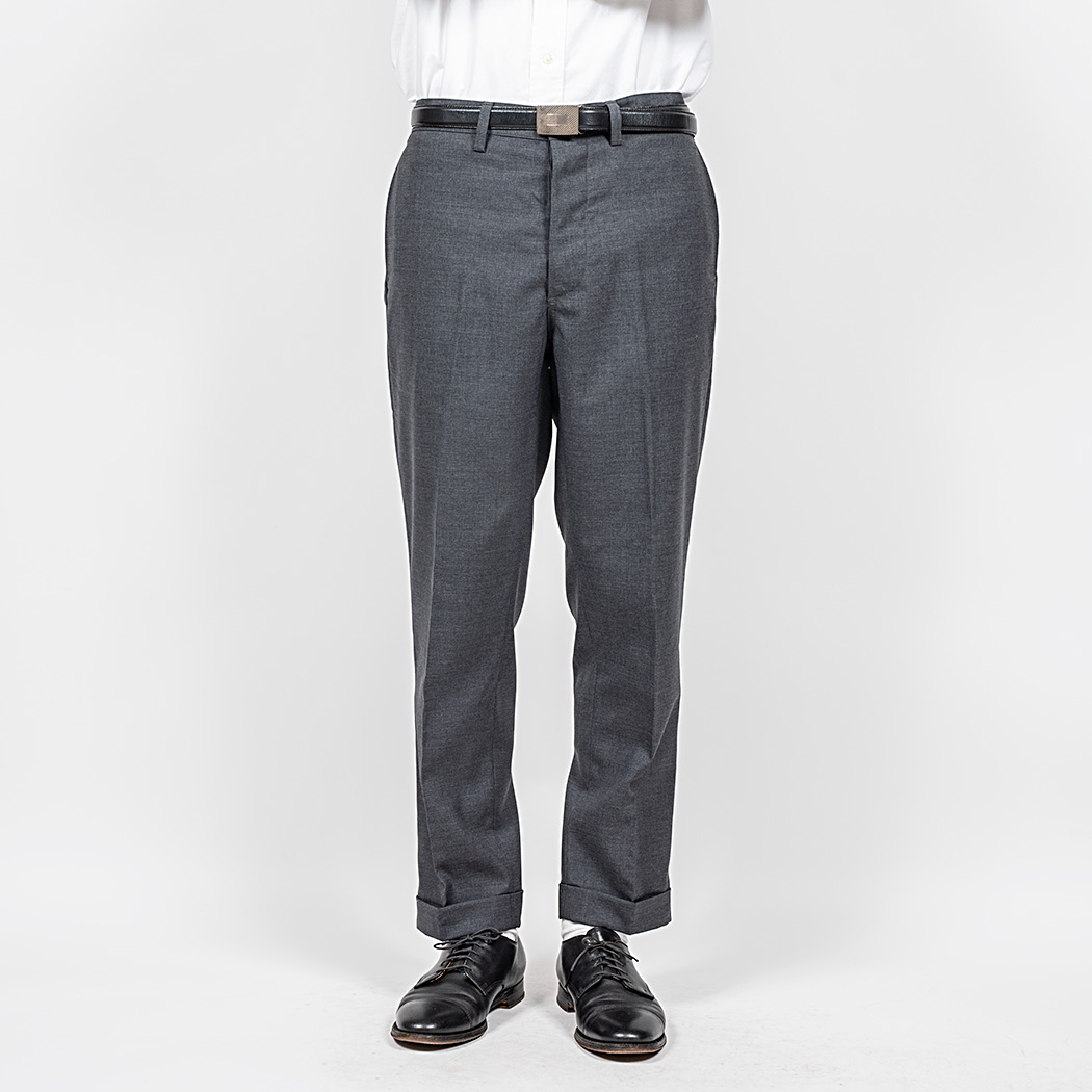 裾幅19 センチ程のやりすぎないスリムフィット。プレインフロント(前にタック無)、サイドの縫い目利用ポケット。バックシンチにフラップ付き玉縁ポケット。これでもかと「アイビー」らしい仕様を盛り込みました。