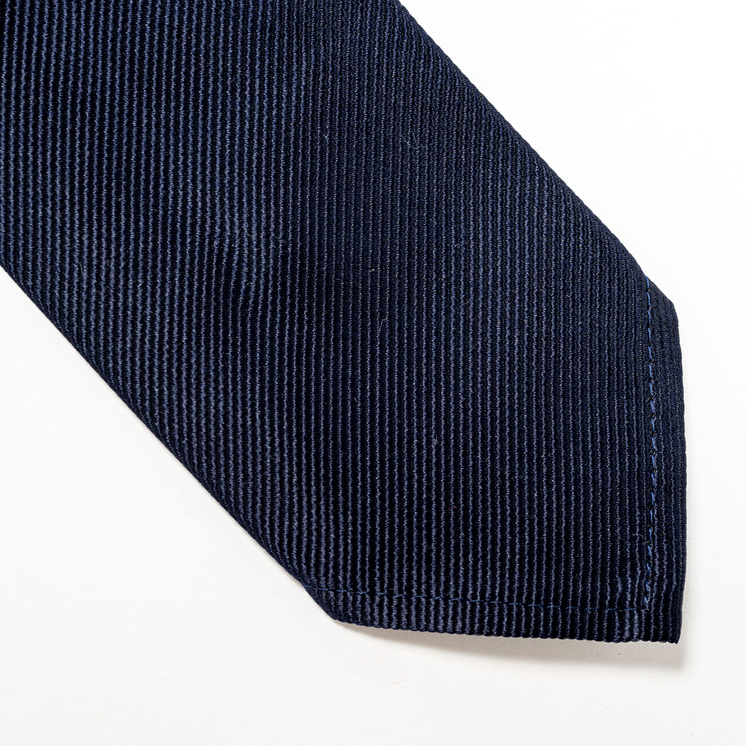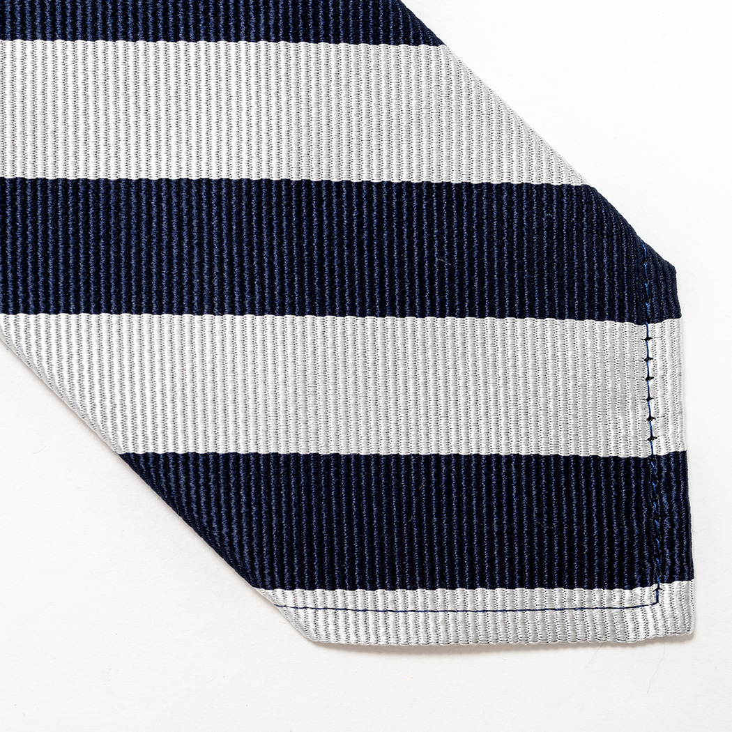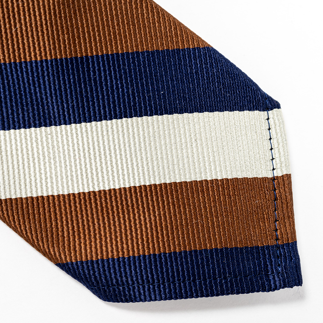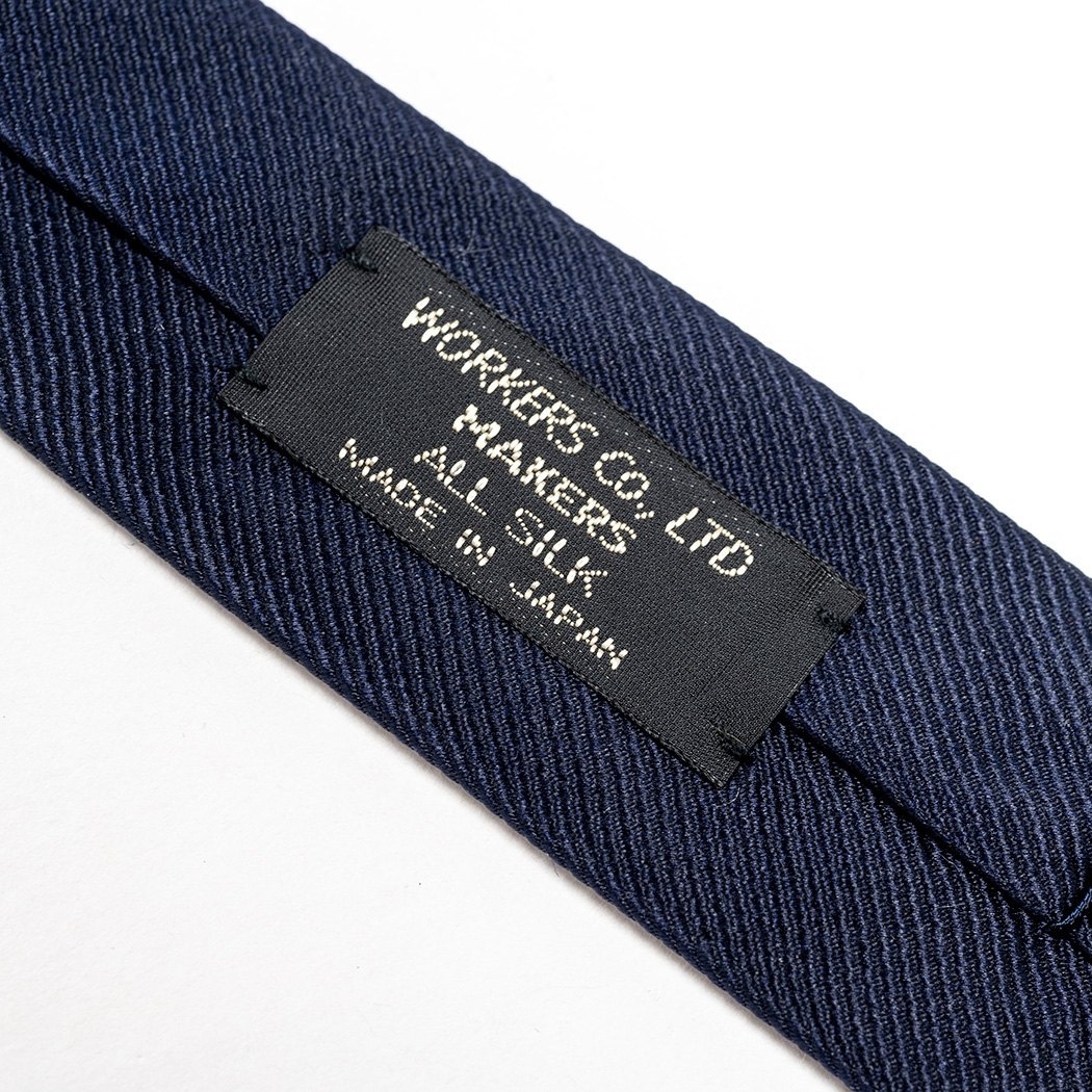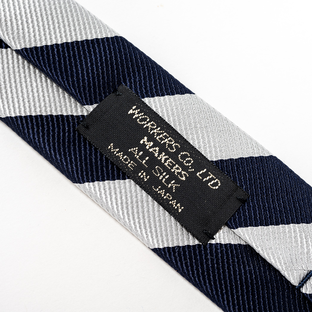 レジメンタルタイ、柄の流れはアメリカ式に左上から右下に流れるよう、裁断。 縫製はあえてミシンステッチで剣先を三つ巻き。剣先に裏地がつかない分、軽やか。芯も薄め、かつノットの部分を細い型紙。これが、WORKERSのネクタイ独特な「細いノット(結び目)」を生み出します。