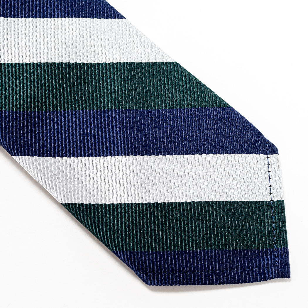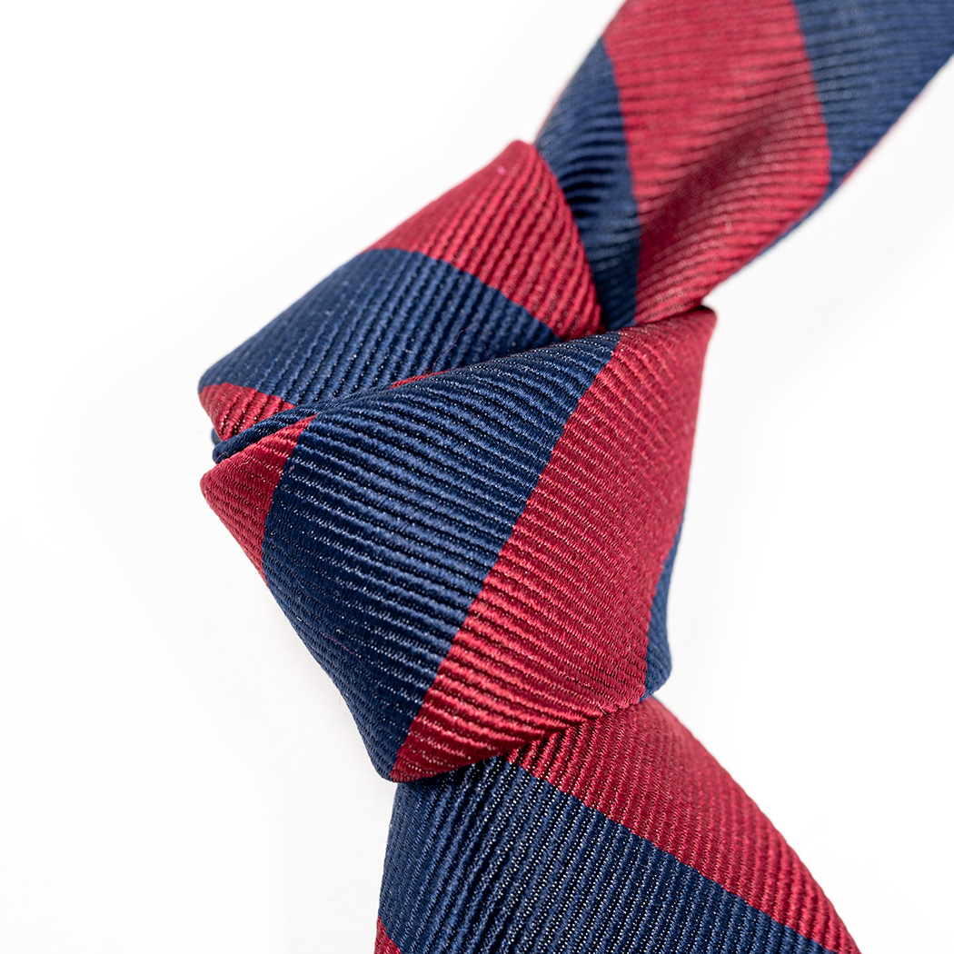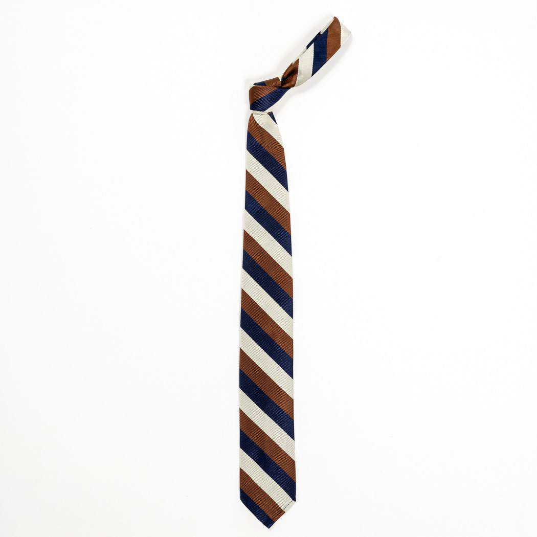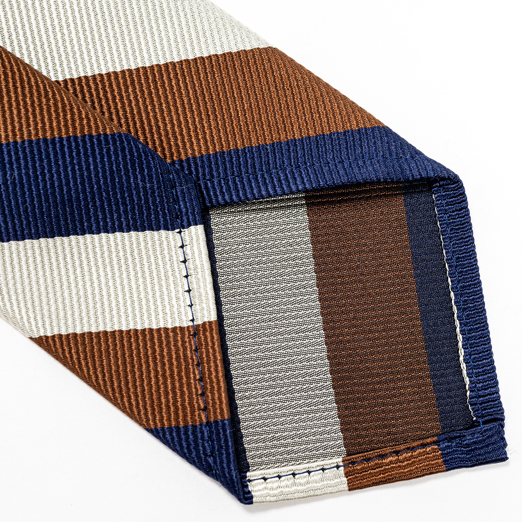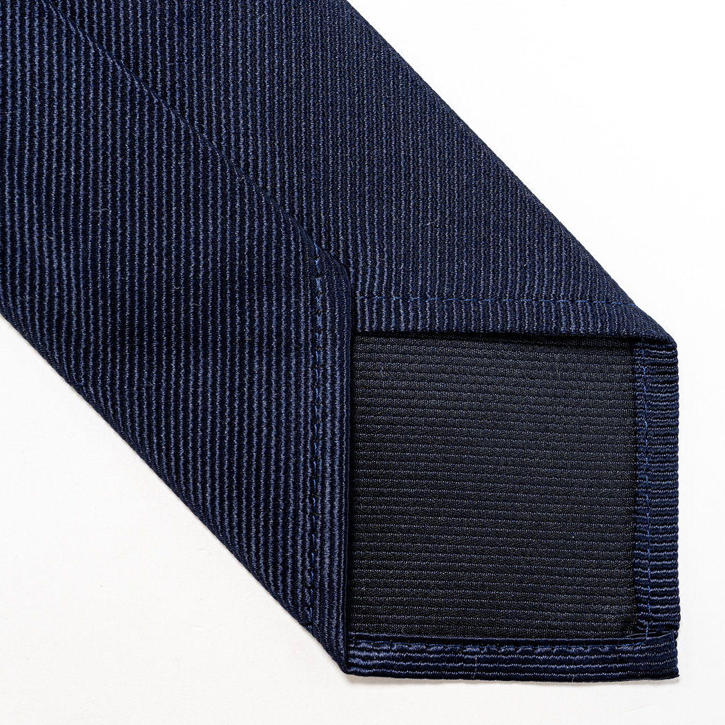レジメンタルタイ、柄の流れはアメリカ式に左上から右下に流れるよう、裁断。 縫製はあえてミシンステッチで剣先を三つ巻き。剣先に裏地がつかない分、軽やか。芯も薄め、かつノットの部分を細い型紙。これが、WORKERSのネクタイ独特な「細いノット(結び目)」を生み出します。