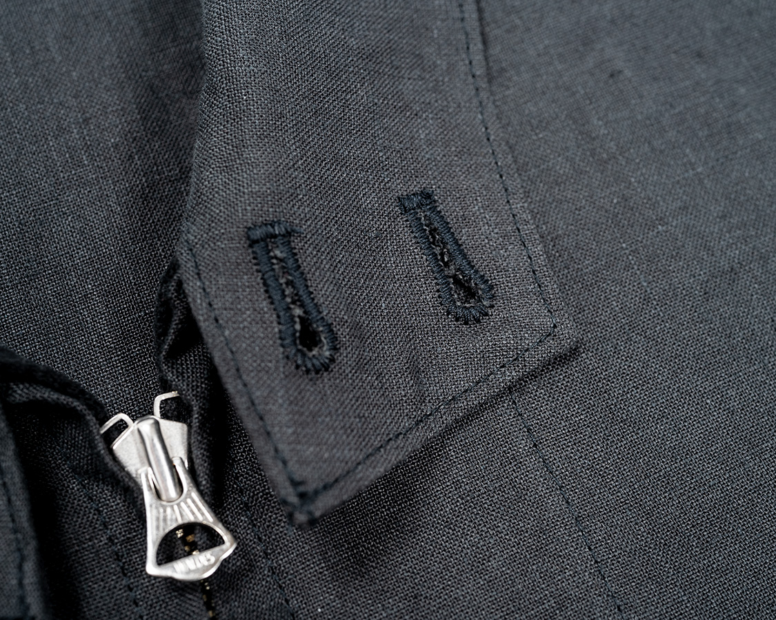| ボタンホールはハトメ+ムシカン。虫のように小さいカンヌキなので通称「ムシカン」 |