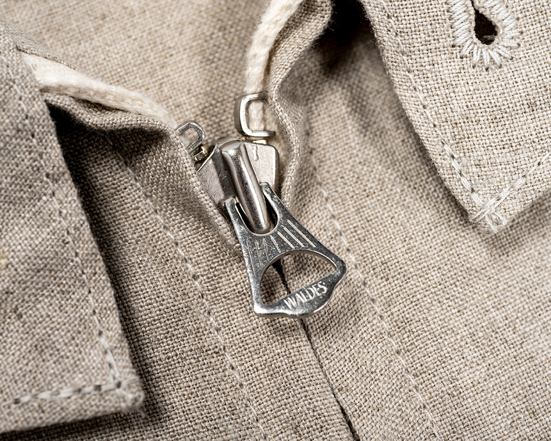 前ファスナーはWALDESのオートマチックロック。上端はコ型の止め。ちょっと古いTALON風の引手デザイン。