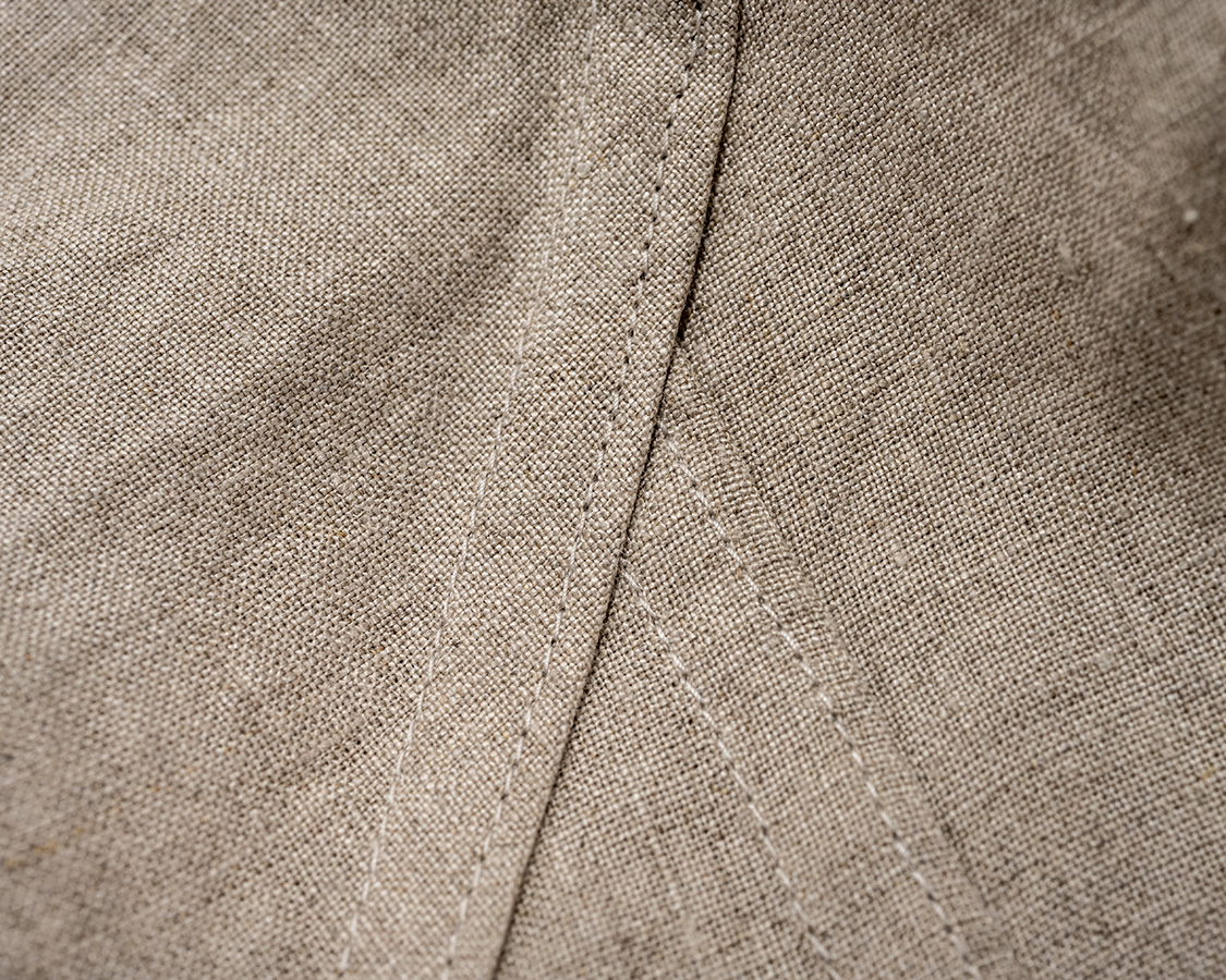 先ほどの袖の折伏せ縫い+脇の巻縫い。折伏せも巻きも、生地がお互いに噛み合いますが、巻縫いは金具+2本針ミシンで一気に縫います。筒状になる部分は、こちらの巻縫いで無いと非常に縫いづらい。でも、巻縫いはアイロンではなく金具一発で巻くから難しい。どちらの仕様も、それなりに手間や技術が要ります。