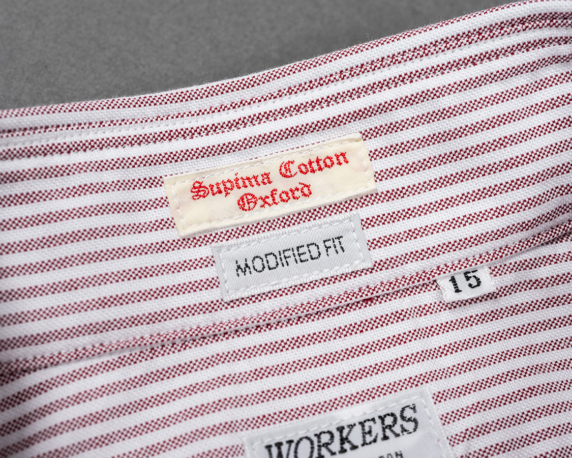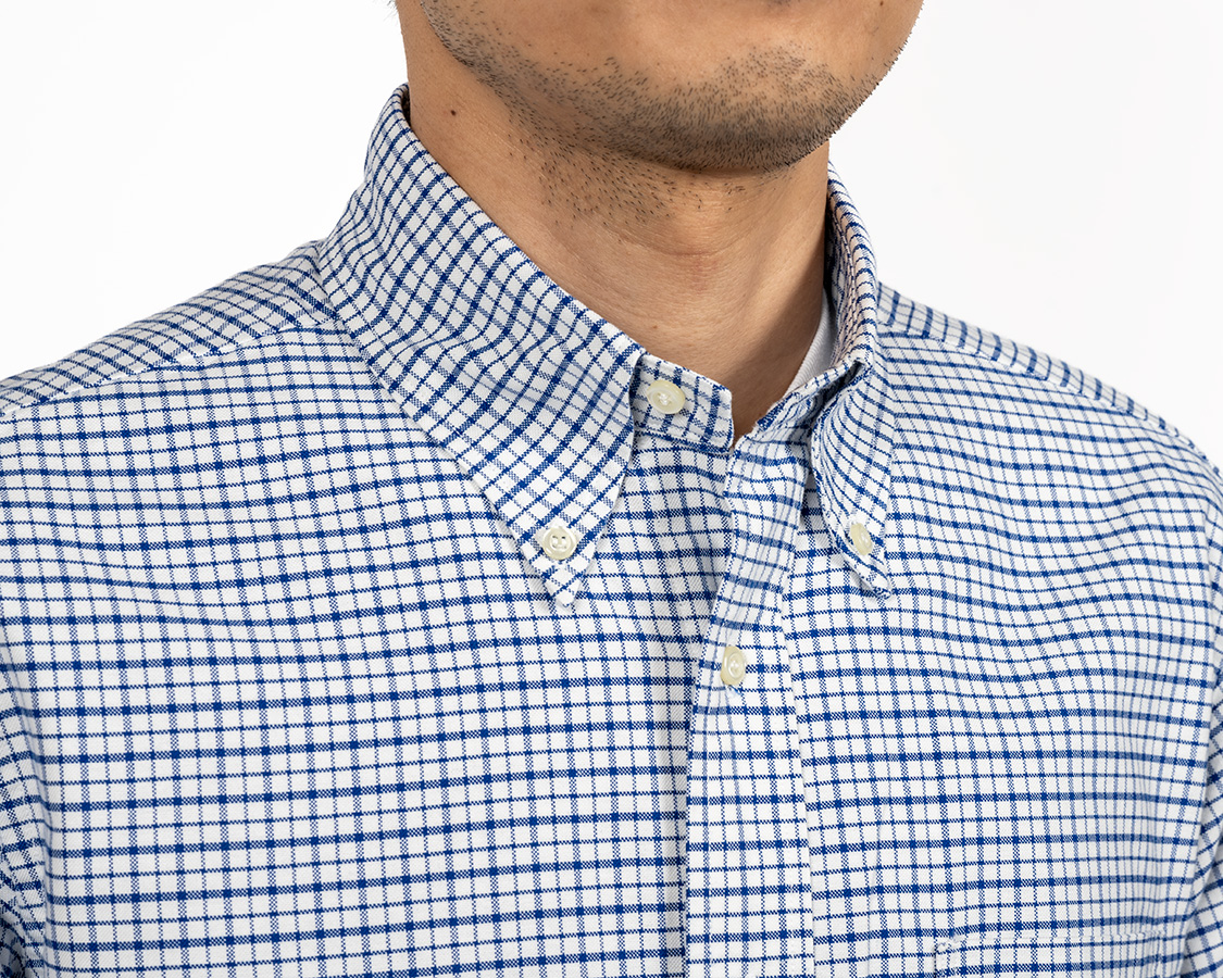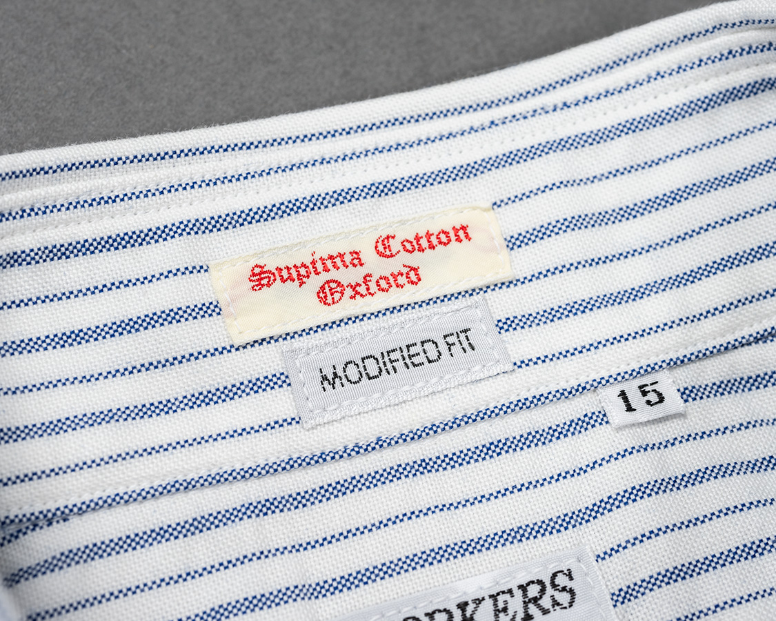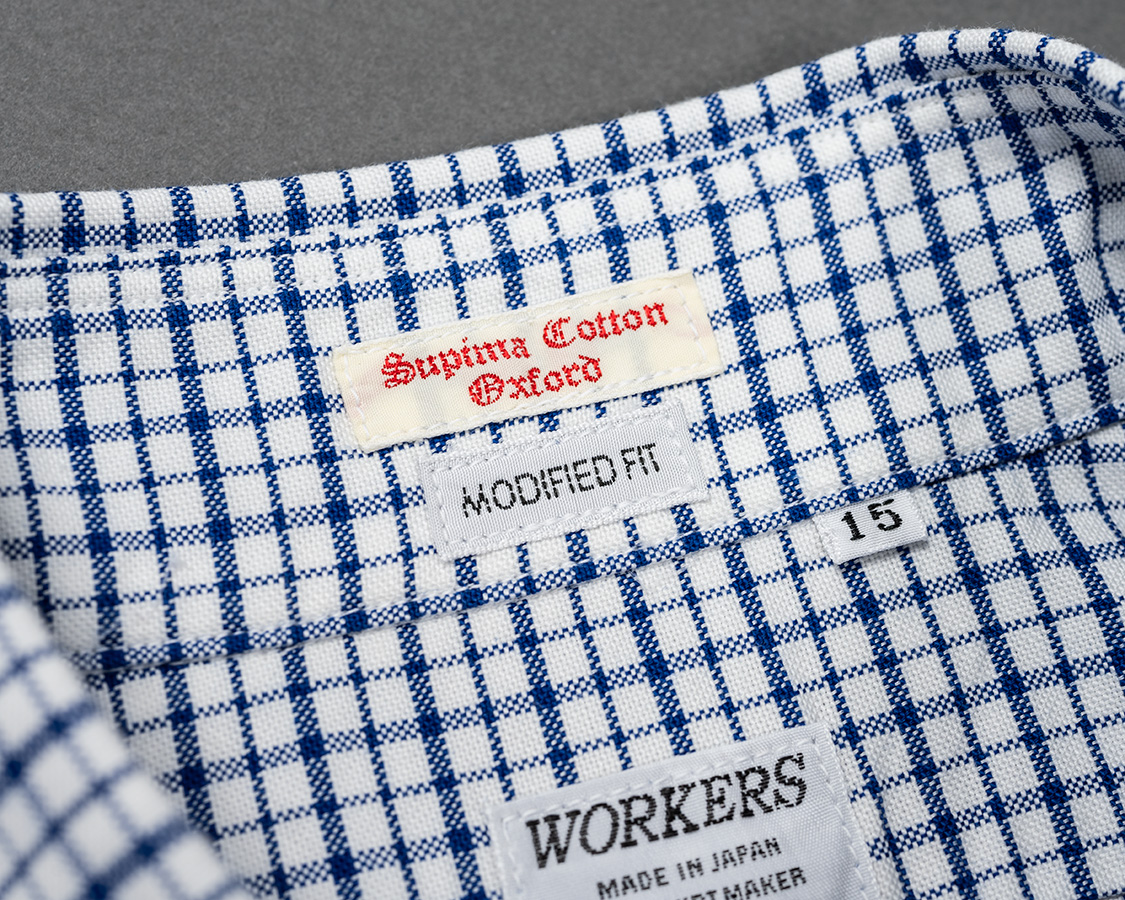 スーピマコットンの柄物オックス。不等ピッチのブルーストライプ、ブルーチェックはWORKERS別注。何か愛称を・・・という事で、我が家のマチちゃんの名前からMatilda Stripe、Matilda Checkと名付けました。