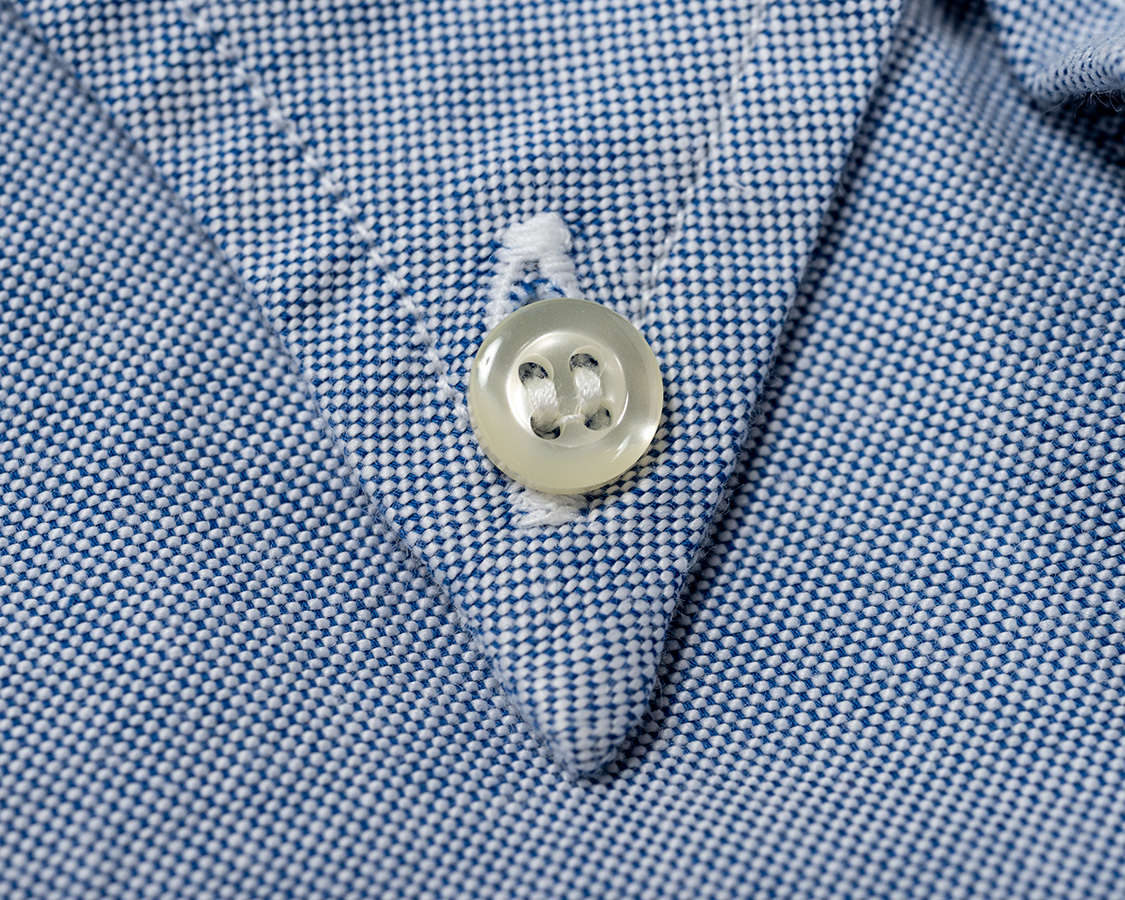 羽襟先、ステッチにかかるギリギリに開けたボタンダウンのホール。ここに開けるのは、厚みが不安定なので難しい。でも、これが奥に行くとどうもかっこ悪く感じます。
