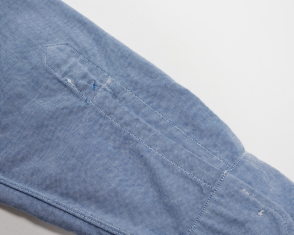 袖口カフス。表からステッチあり、裏にステッチ無し。中に入っている芯だけを表カフスに止めるステッチ。もともとは接着の無い芯を使っていたので、その時学んだ仕様。古着がこうなっていたのです。