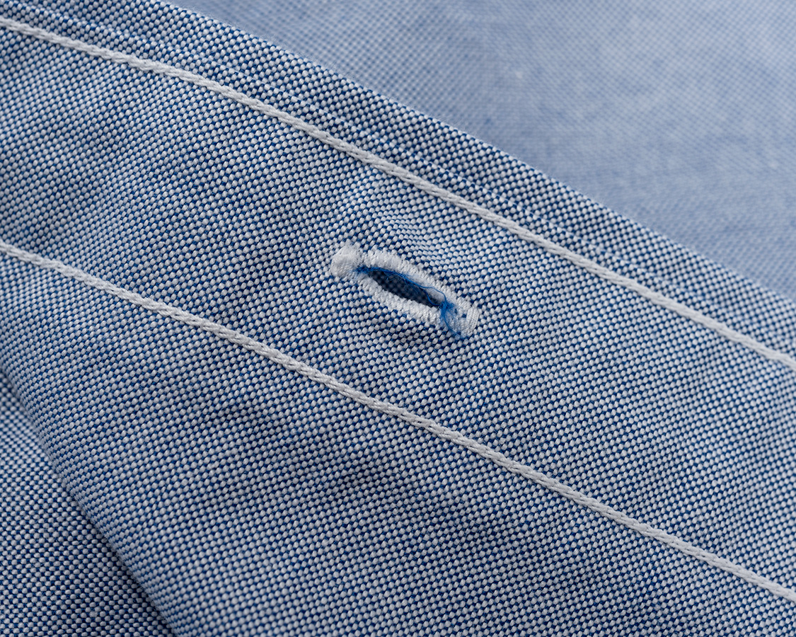 が、その後、オックスはボタンホールが長く着用すると壊れてしまう事がある。そこで、今は半分解展でおなじみの長谷川君に相談。当時彼は企業パタンナーで、さまざまな生地・それに対応する芯など本当に詳しかったのです。教えてもらった、非常に薄い、ほとんど芯が入っているのがわからない接着芯を試すと・・・ホールが見事壊れない!という事で、今は接着芯なのでステッチは貫通しても良いのですが、当時の名残で芯止めステッチが残っているのです。