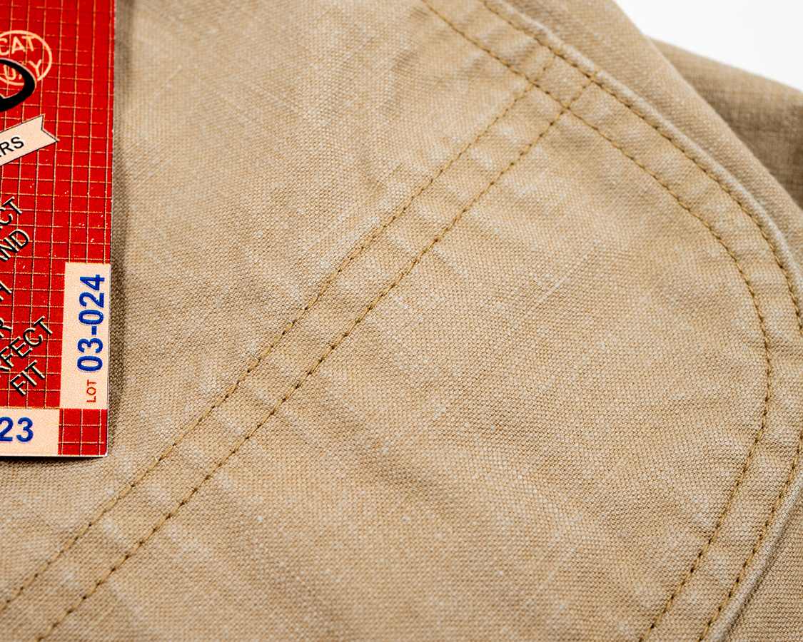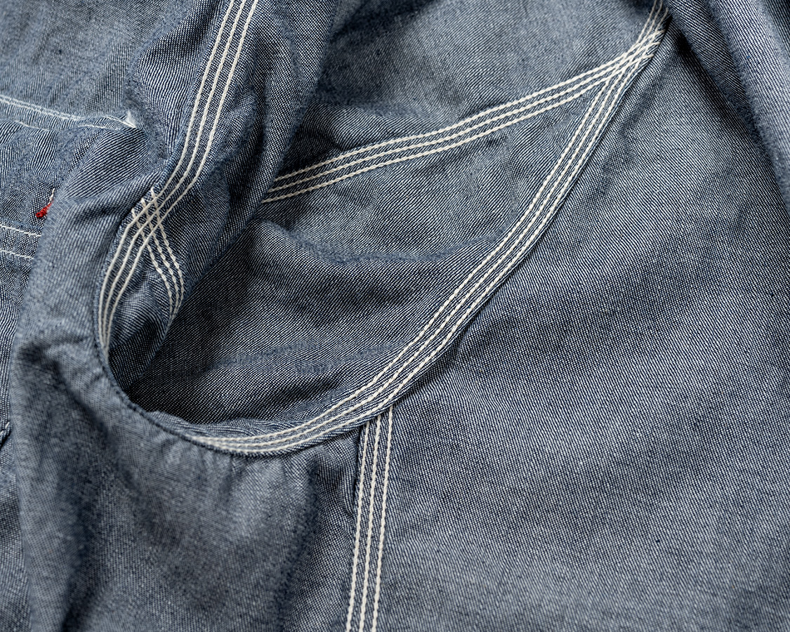 袖ぐり部分。袖同士のトリプルステッチ、身頃と袖のステッチと、これでもかとステッチが並ぶ部分。いかにも「ワークウェア」的な仕様。