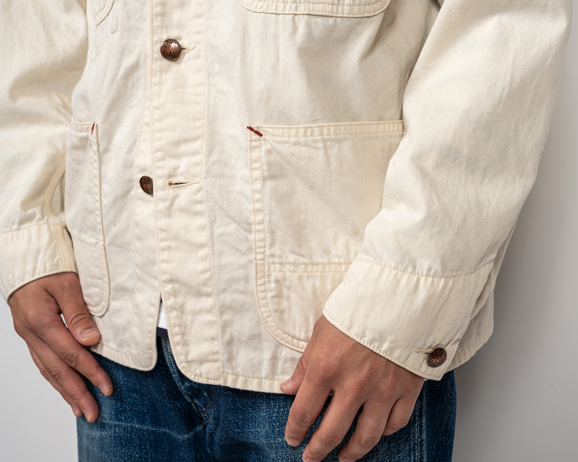 ワンウォッシュでボタン表面のメッキが少し落ちて良い雰囲気になっています。「永遠に綺麗なまま」ではなく、使い込むごとに良い雰囲気にやれて行く。そんなボタンを目指して墨入れ無しにしたのですが、結局、墨も欲しくなり自分でペンで入れています。墨入れも落ちすぎず、かつ、微妙にハンドメイドなのでにじんでいて良い雰囲気です。