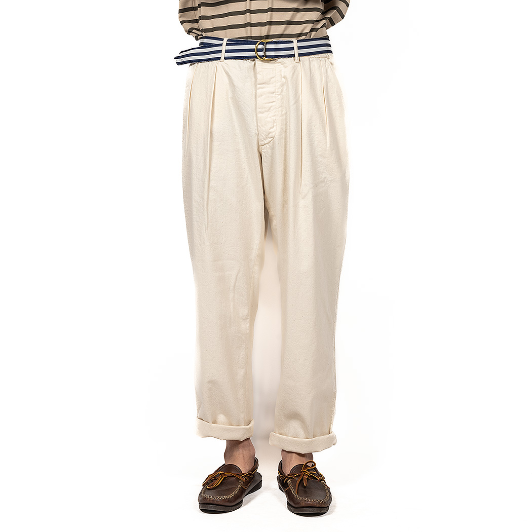 80-90年代っぽいので、ある意味合わせ方はなんでもOK。しっかりシャツをタックインして、上にネイビーブレザーでトラッドっぽく着るもよし。カットソー合わせてもっとラフも良し。ゆったりしたシャツの裾を出して着るもよし。「なんでもあり」だった時代のトラウザーズをモデルにしているので、合わせが楽です。