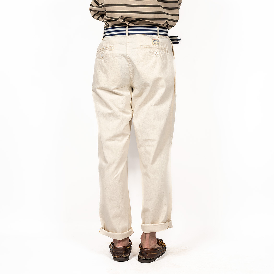 腰回り・ヒップにゆとりがあるので動きやすい。裾はあえてジーンズのような1センチ程度の幅の三巻始末。腰のタック見ると、古いミリタリーのチノパン あたりをモデルにしているのかな?とは思いますが。全体の仕様は80-90年代的な簡素で強度はしっかりあるもの。この「レプリカとも違う」「80年代、ぎりぎりMade in USAでやれる範囲」の仕様を再現しています。