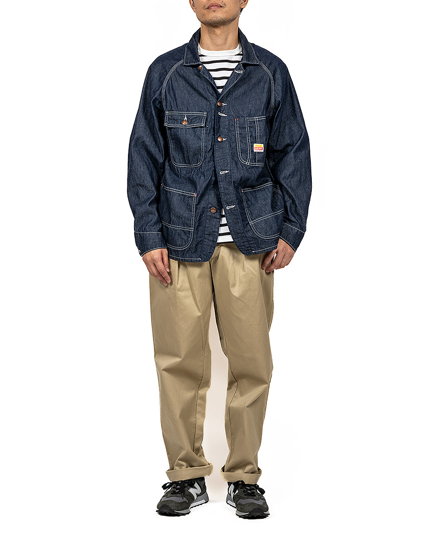 デザインの参考はJ.C.Penney系のあれです。オリジナルをいくつか持っていたので着てみたり、パターンを取ろうかとしたのですが・・・オリジナルはシルエットの癖が強い。肩がボコっと出てイビツ。だったらと、WORKERS オリジナルの2 ピース袖パターンで。ポケット、袖口、襟といった部分はオリジナルを参考にしています。