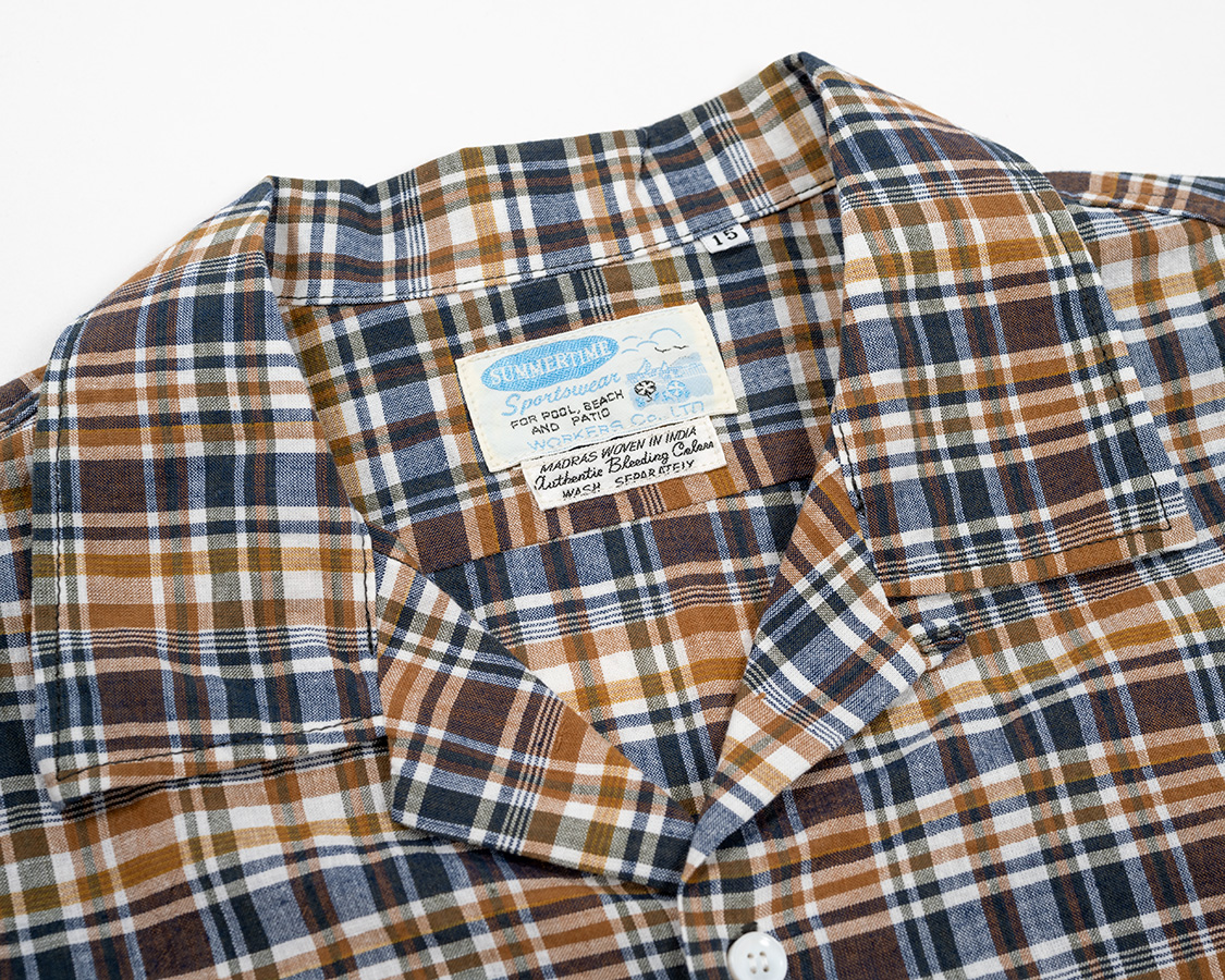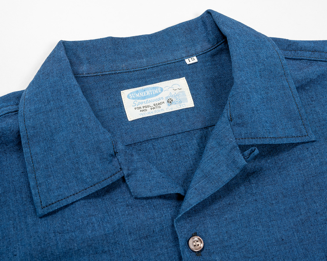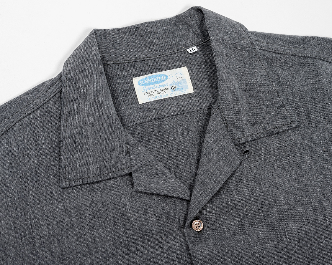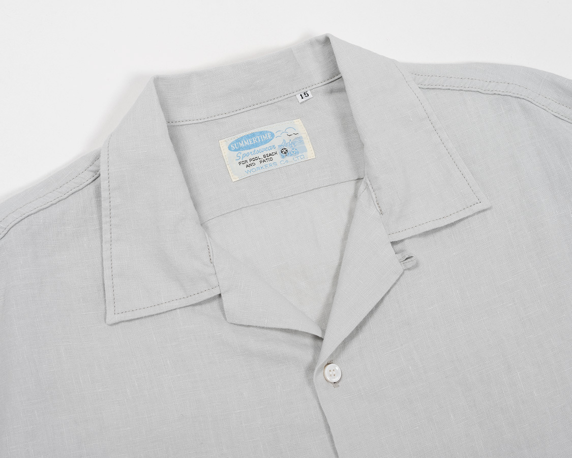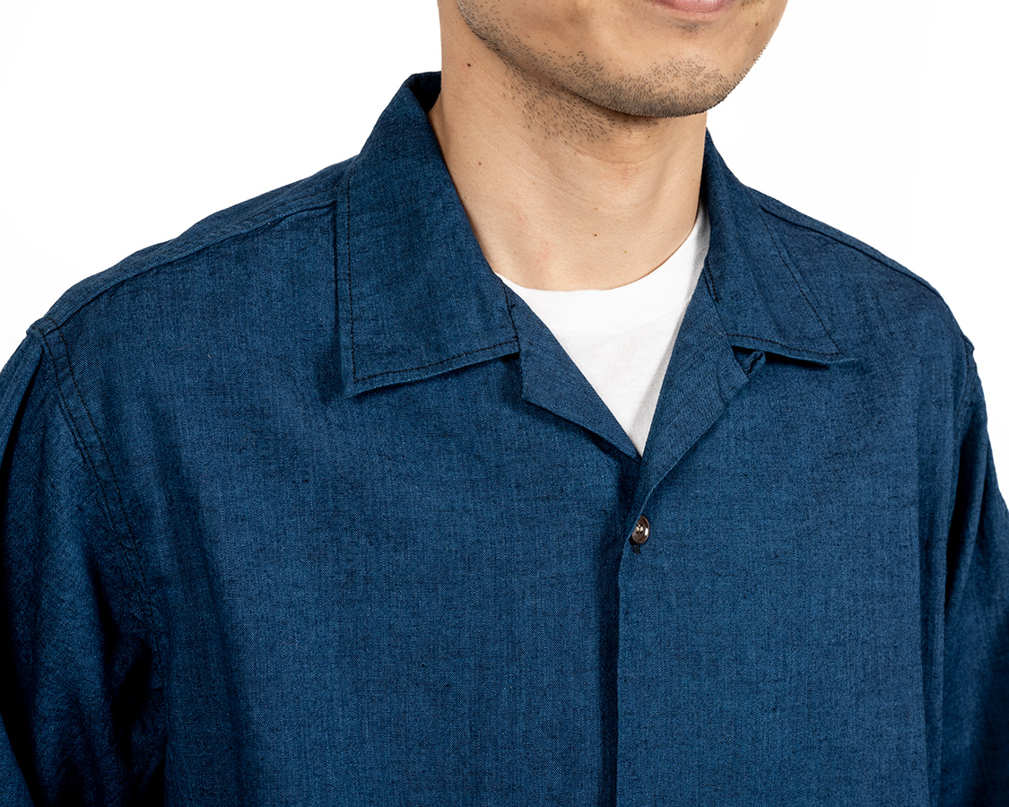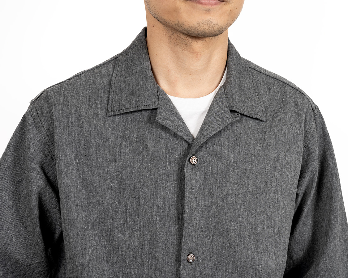 オープンカラー。その名の通り、台襟が無く、首回りが開いているのが特徴。中のTシャツは見えるので、ネックがしっかりした物を着ましょう。