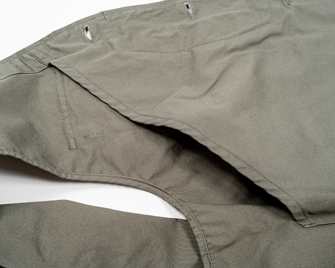 それはWORKERSの品質基準ではNG。でも、袖ぐりに見返し(別布)はつけたくない。そこで思いついたのが、肩の縫い代を倒して、そこを隠すように薄い布を当てる始末。結果、ステッチの入り具合がいかにも「機能性重視の服」のようでもあり、表に出るステッチがデザインにもなる。我ながら、良い仕様だと思います。