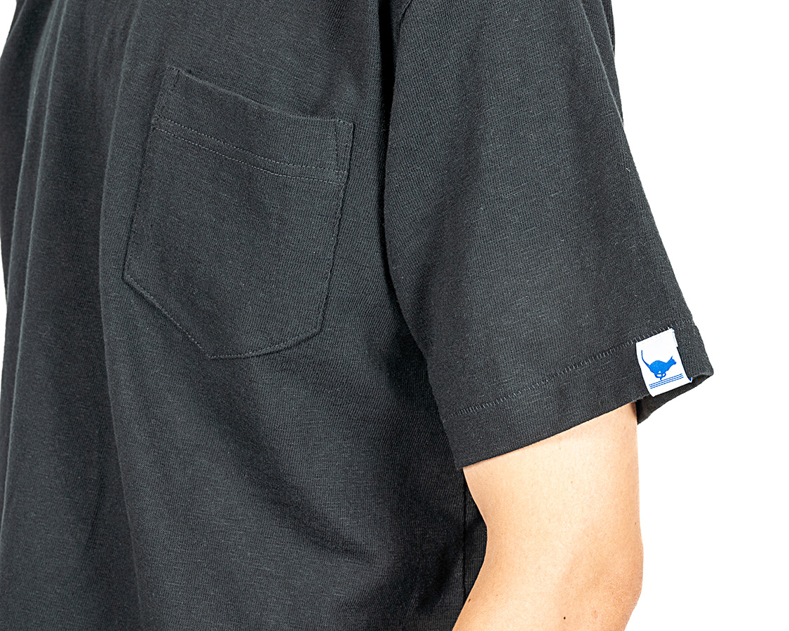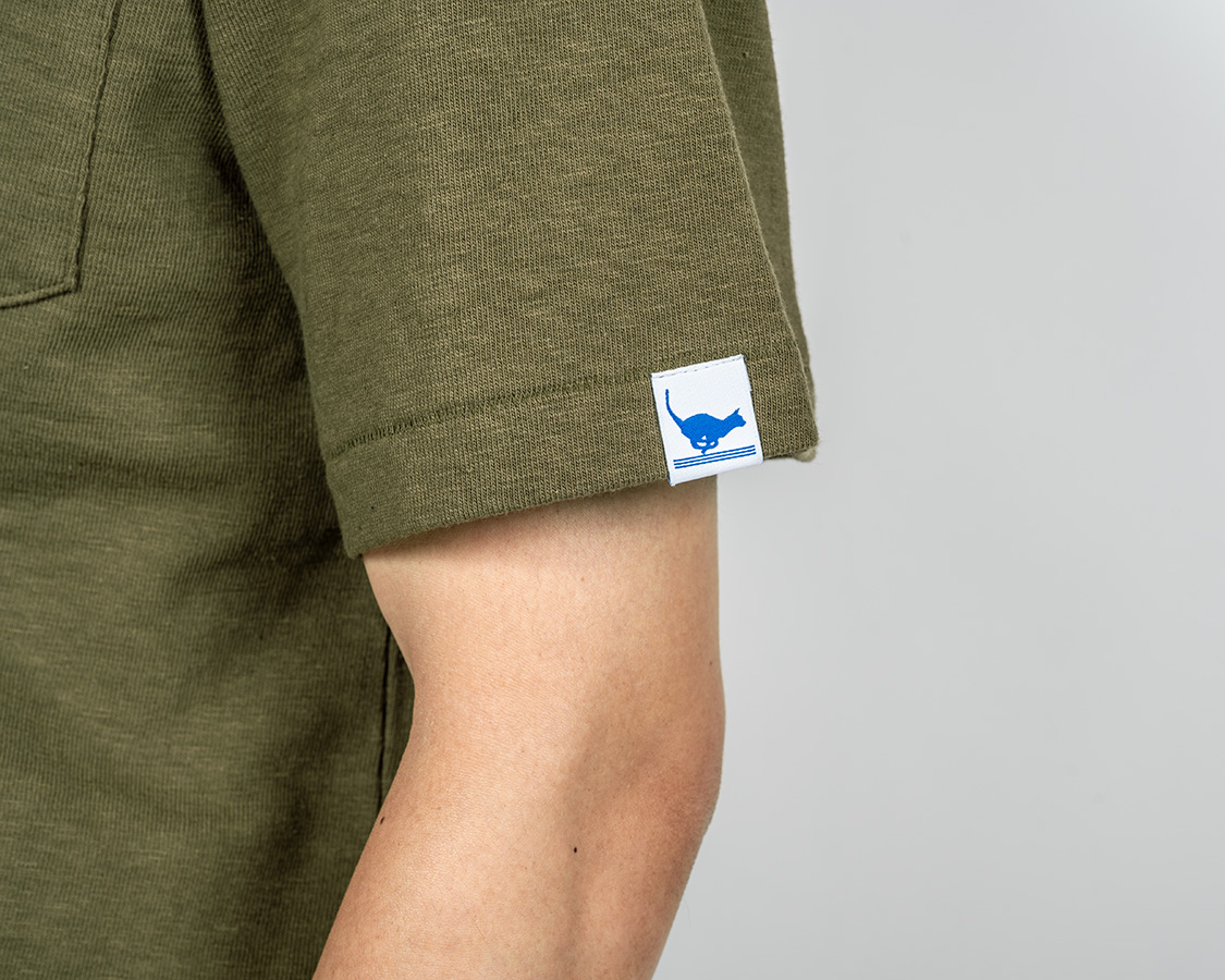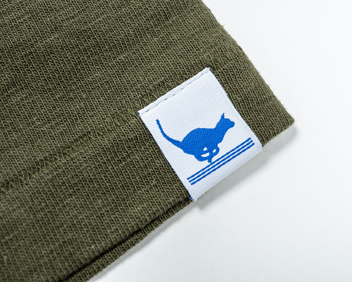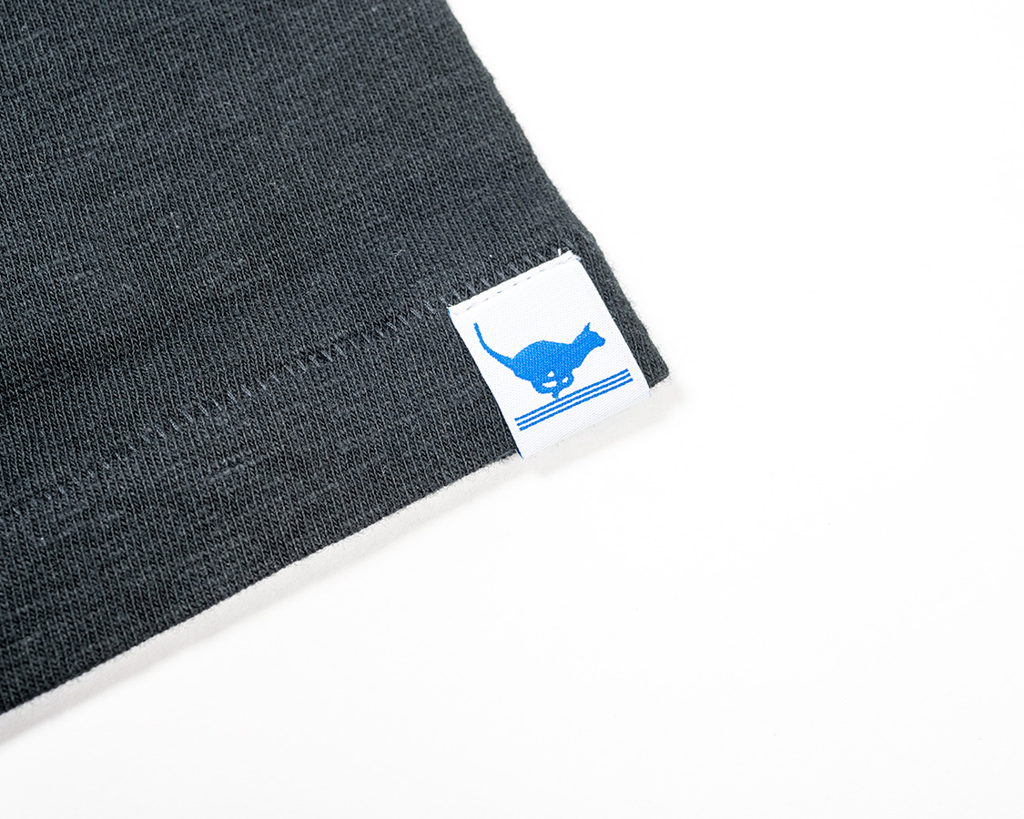 左袖にはランニングキャットネーム。今まであまり外から見てわかるネームはつけませんでしたが、我ながら、Tシャツもよいものが作れるようになった!と自負でつけてみました。ただ、高かった!超高密度織りでこそ再現できている猫のエッジが見どころ。