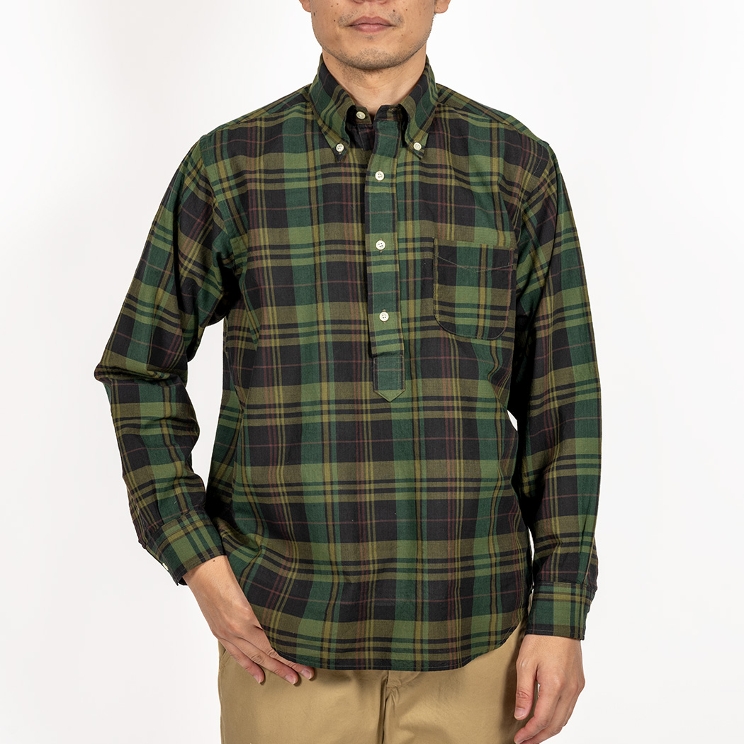 シルエットはModified Fit を元にしつつ、脇の絞りを無くしゆったりとした着心地に。 プルオーバーは前が開かないので体が動いた時に突っ張る感じが出ると着にくいので。