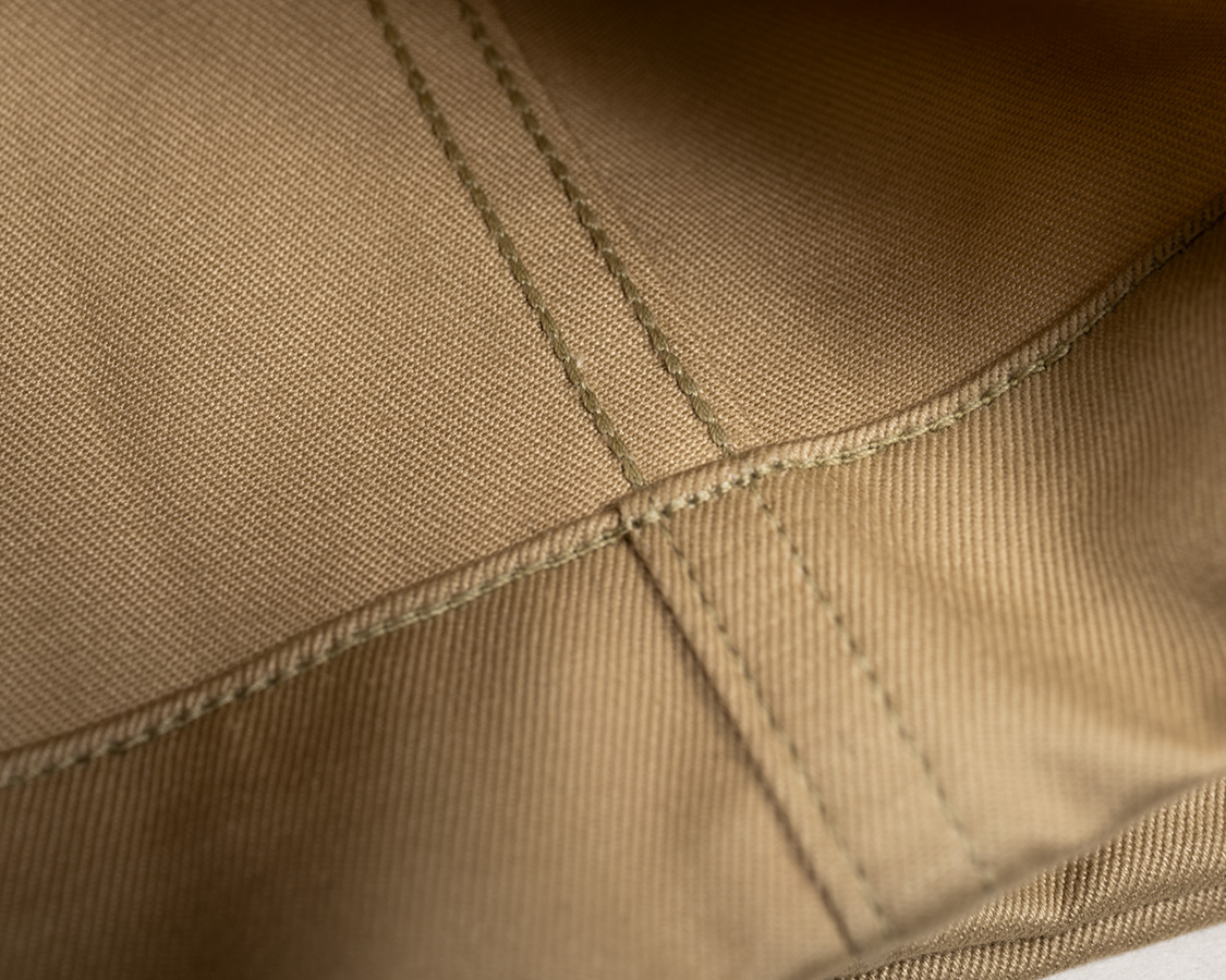 背面、左右にタックでヒップの丸みを出す。左右の細玉はどうしても口が少し開きます。これが古着のチノパンっぽくもある部分。
