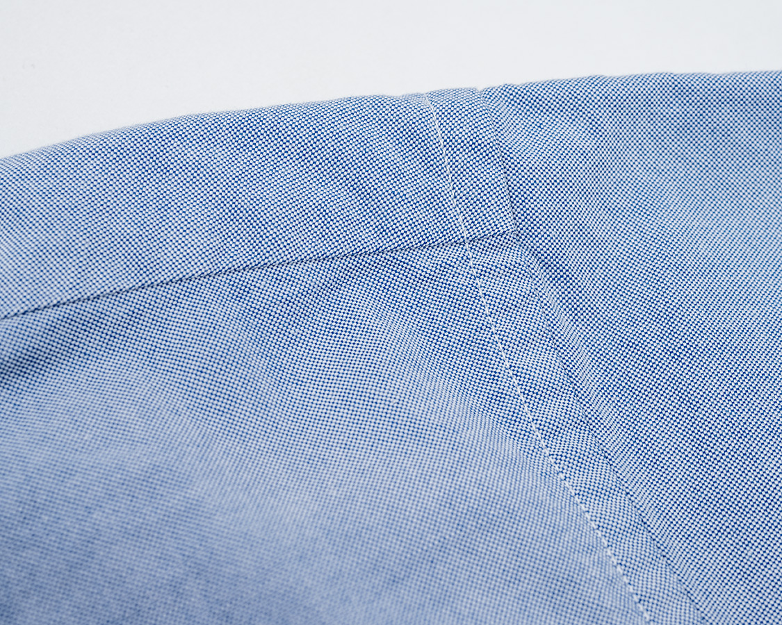肩はステッチなし、袖ぐりはチェーンステッチの折フセ。このあたりは、WORKERSのボタンダウンで定番の、綺麗な縫い方。