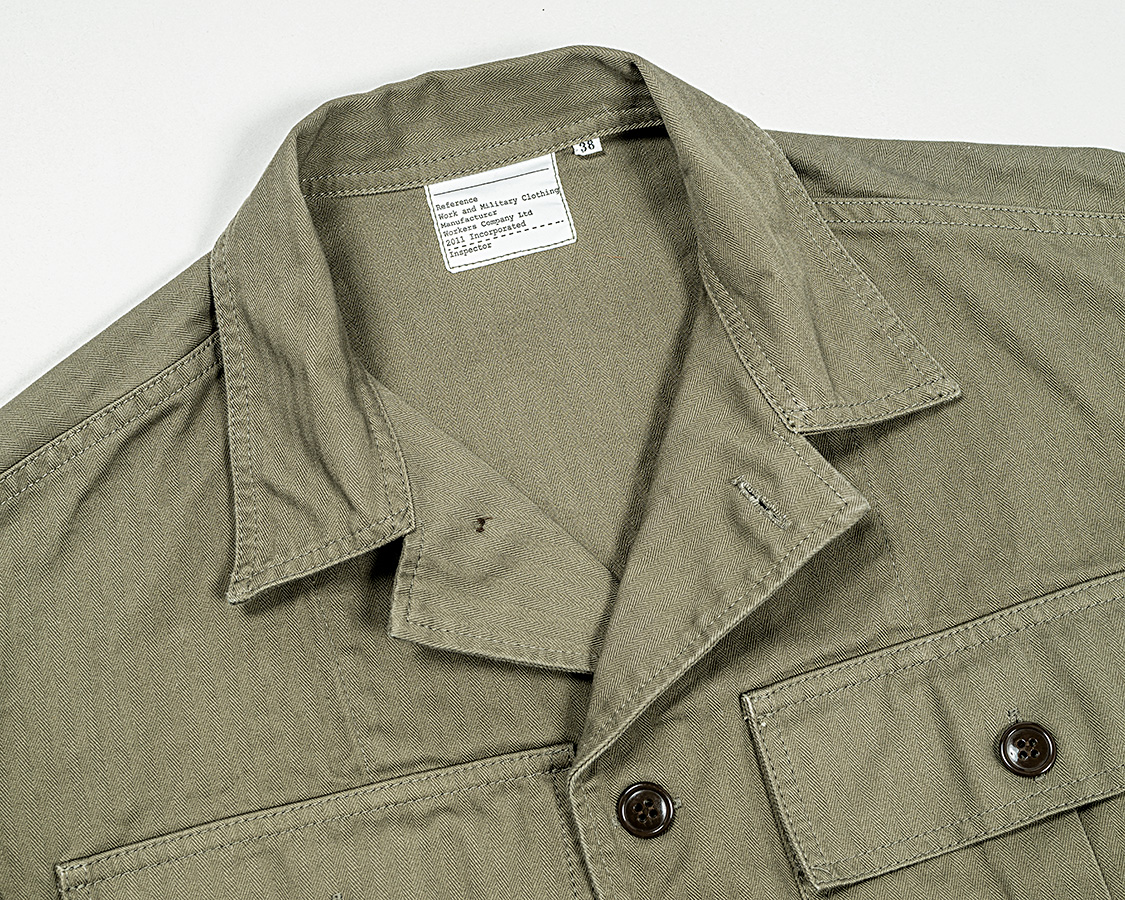 2-Toneは胸ポケットだけヘリンボンでも色味が違う、別生地で作っています。ミリタリーで見かける「色ぶれちゃってるけど、道具として使うには問題ないだろう」をデザインに活かした仕様。
