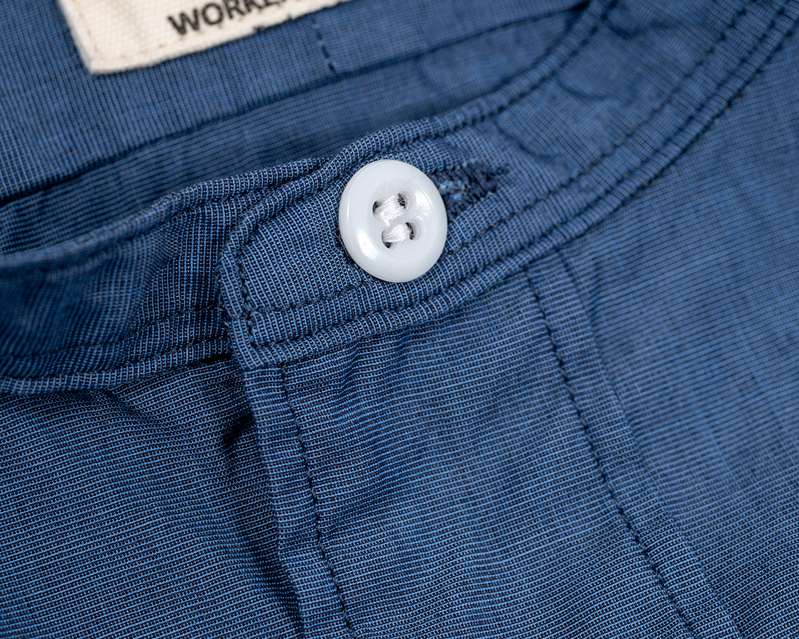 実は、現在はボタンホールの強度を高める為に、「アイロンで接着できる芯だけど、貼ってるかわからないぐらい薄い。でも貼ると異様に穴あけに対する強度が上がる」芯をWORKERSでは使っています。だから、芯止めステッチは無くても良いのですが、これも雰囲気の一部なので残しました。