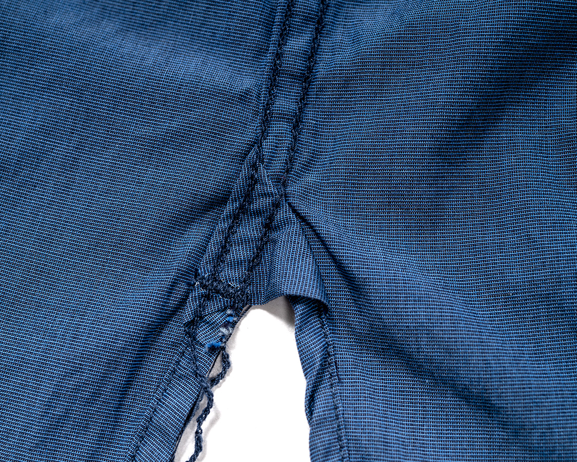 あらかじめ裾にマチを縫いこみ、脇を縫ってきた環縫いの巻き縫い(前後をお互いにかみ合いながら縫う)でマチに向かってステッチを逃がします。