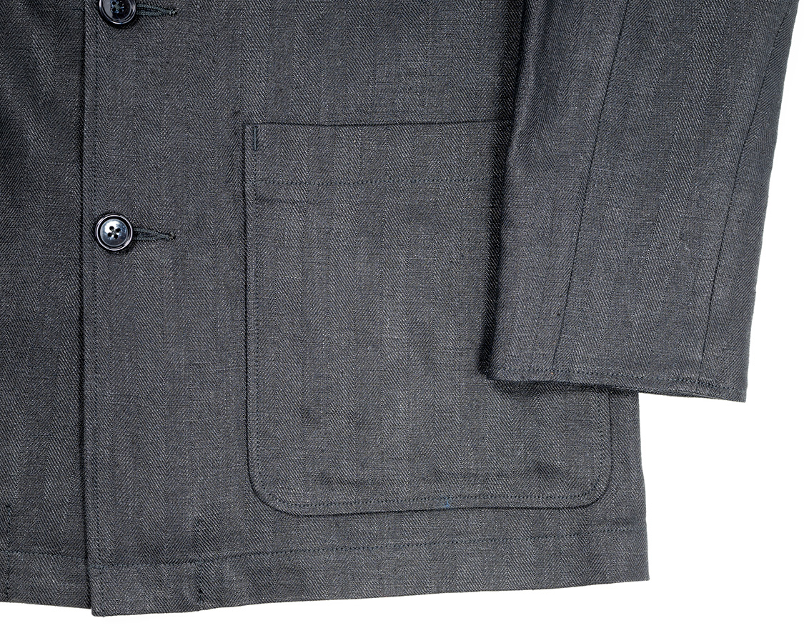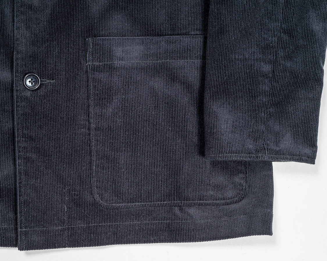 ポケットの淵が浮いているので、ポケットが立体的に見えるので私は好きな仕様です。地縫いしてひっくり返すのでひと手間増えてしまう&返しのうまい・下手が出ます。フォレスティエールを縫ってくれる工場さんはアイロンワークがうまい。工場に行っても、ミシンのド~~~~という音より、アイロンのシュ・シュっとスチームの音のほうが多くしているぐらいです。