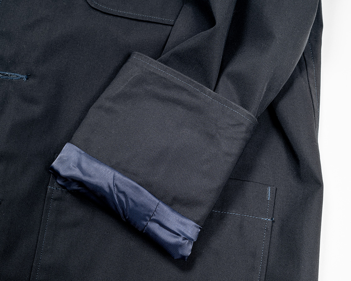 袖口は幅の広い見返しがつき、だいぶ奥から裏地が切り替えしでついています。袖丈直しに出すときも始末しやすい仕様。