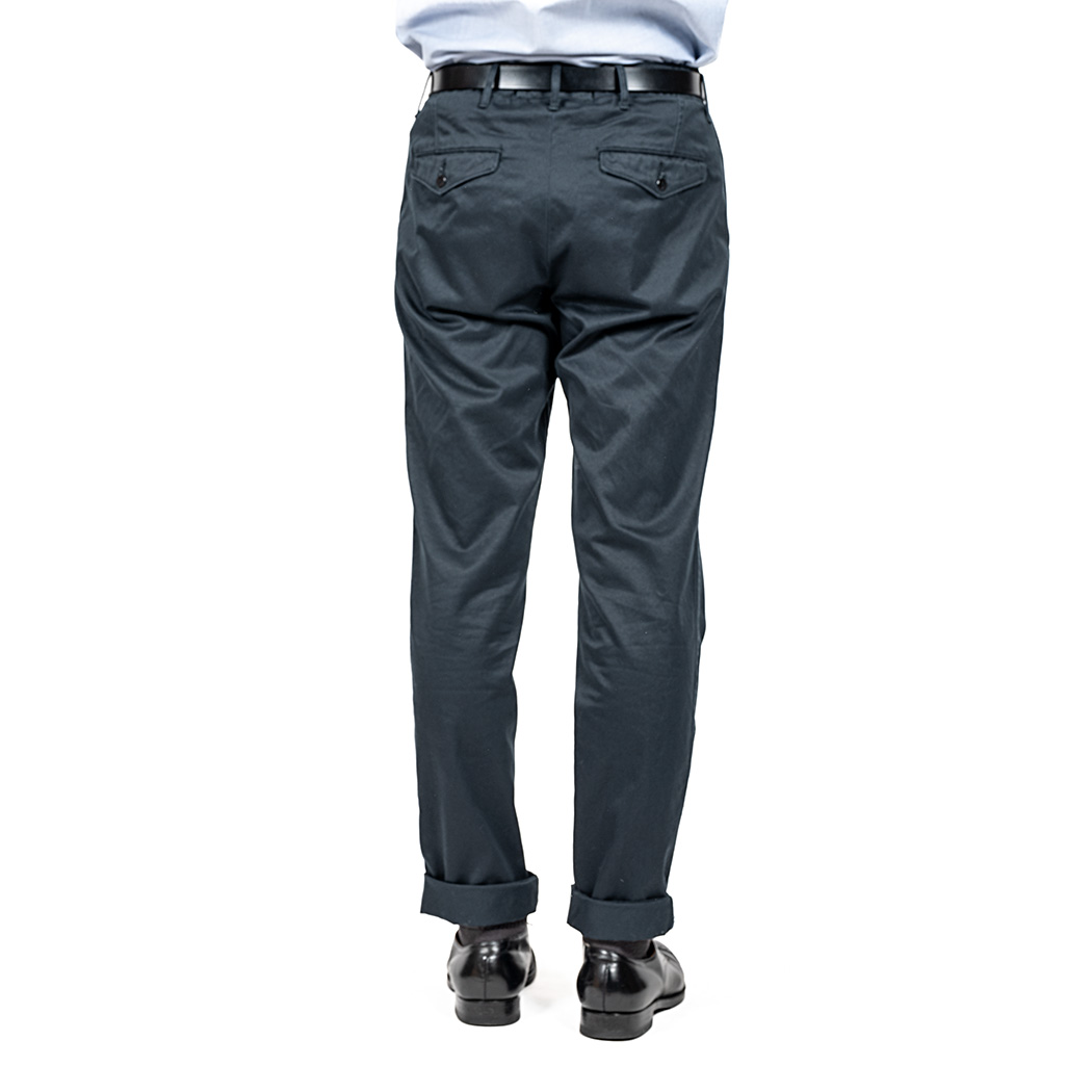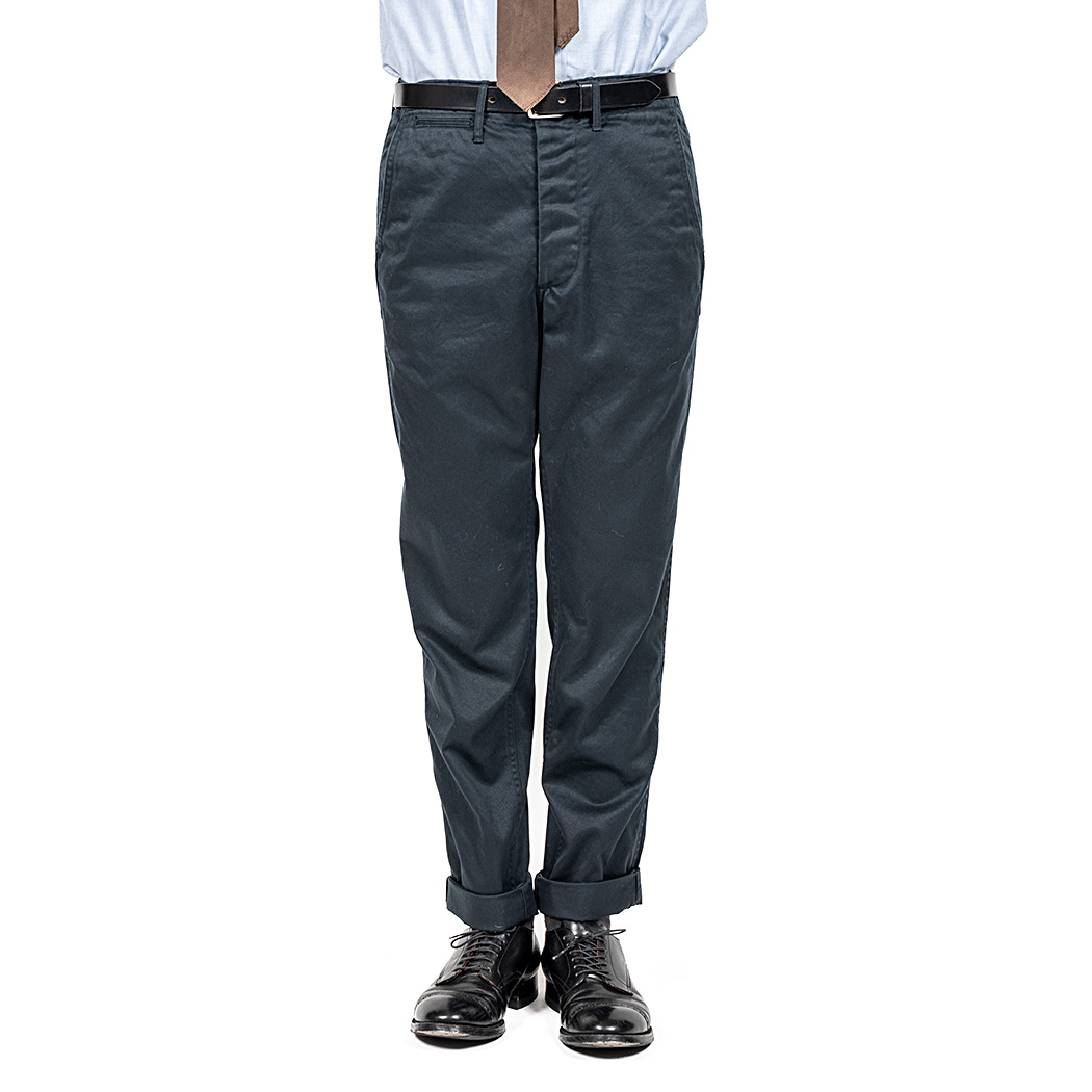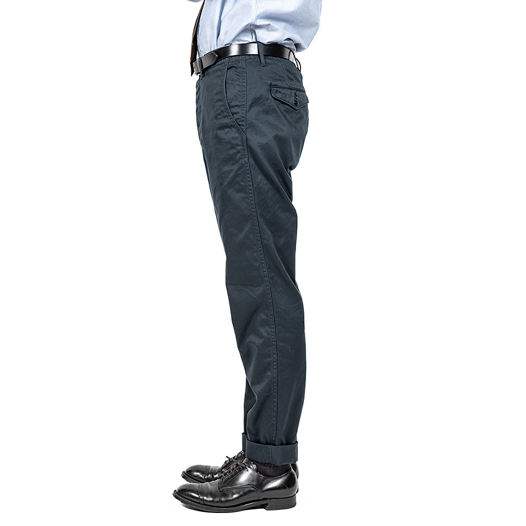 素材は10オンスクラスの高密度チノ。ネイビーは定番。黒に近い色で合わせるものを選ばない。