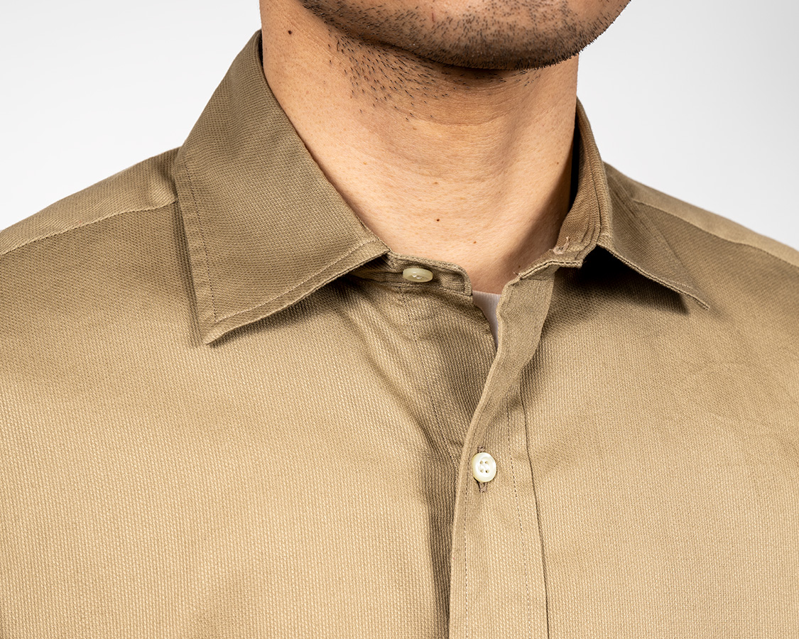 高すぎる台襟、台襟のボタンは2つ、すごいのだと3つ、それを無理やり形にするためガッチガチの芯が入っている、いわゆる「謎のイタリアもどき日本企画、でも中国製」だったりする。あのシャツとはWORKERSのシャツは仕様が違います。