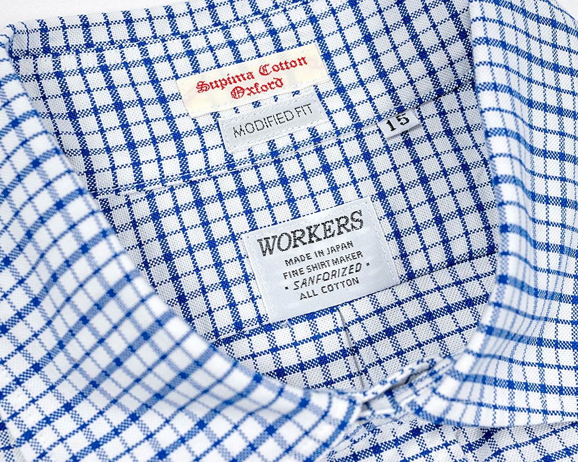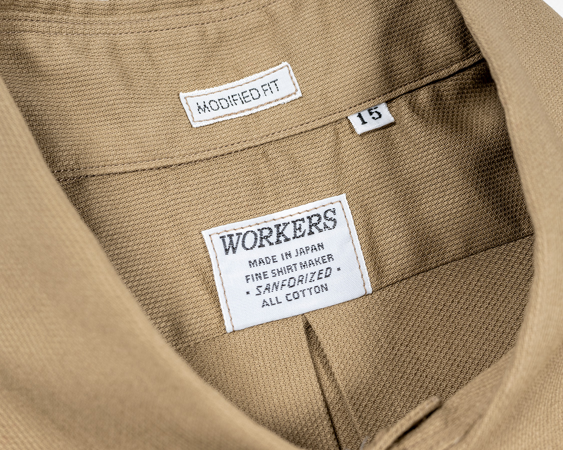 メインのネームは古着のARROW風。そこにフィットネームとスーピマオックス生地には材料ネーム。このガチャガチャ色々ついてるのが、古着で見たあのアメリカのシャツを思い出します。