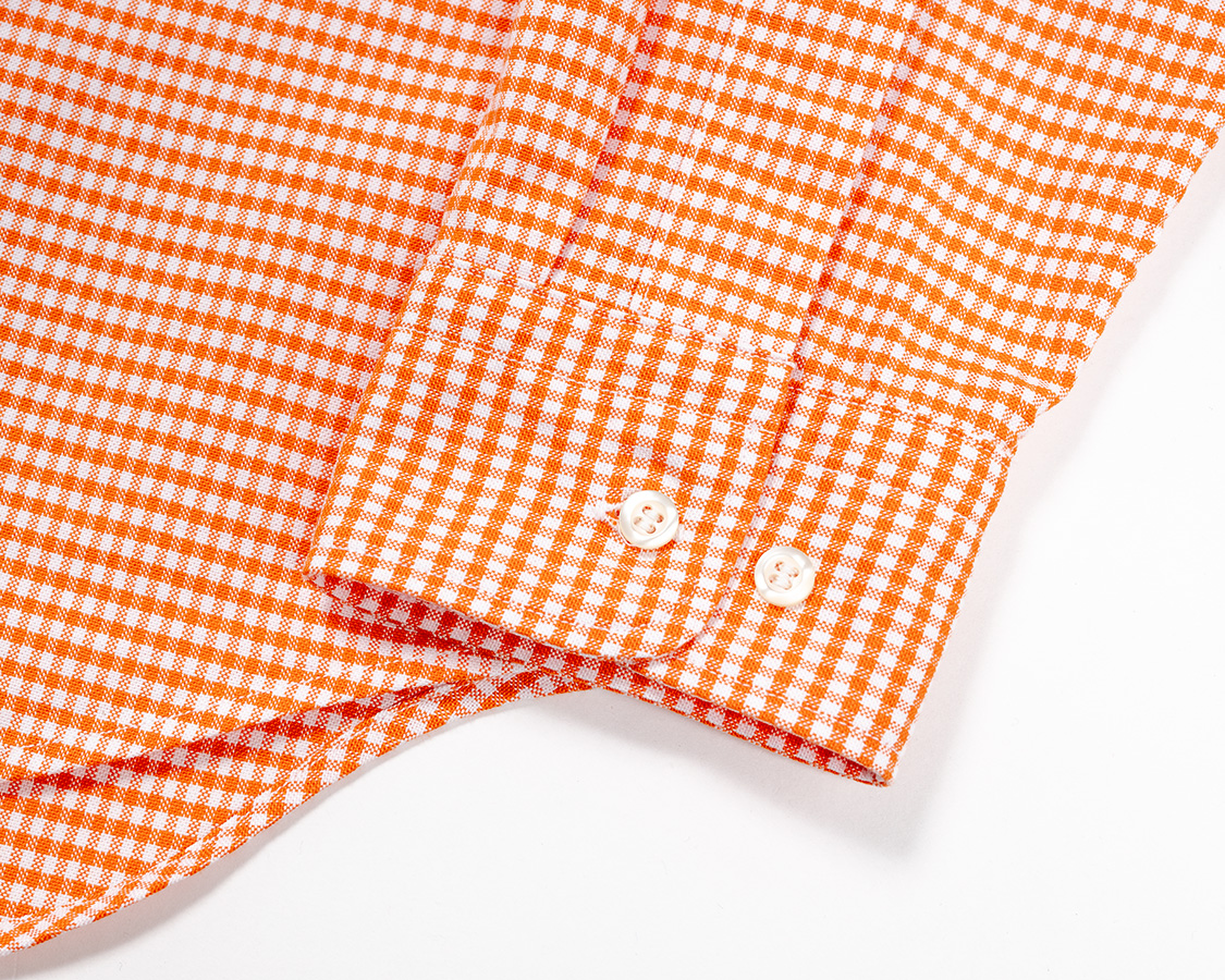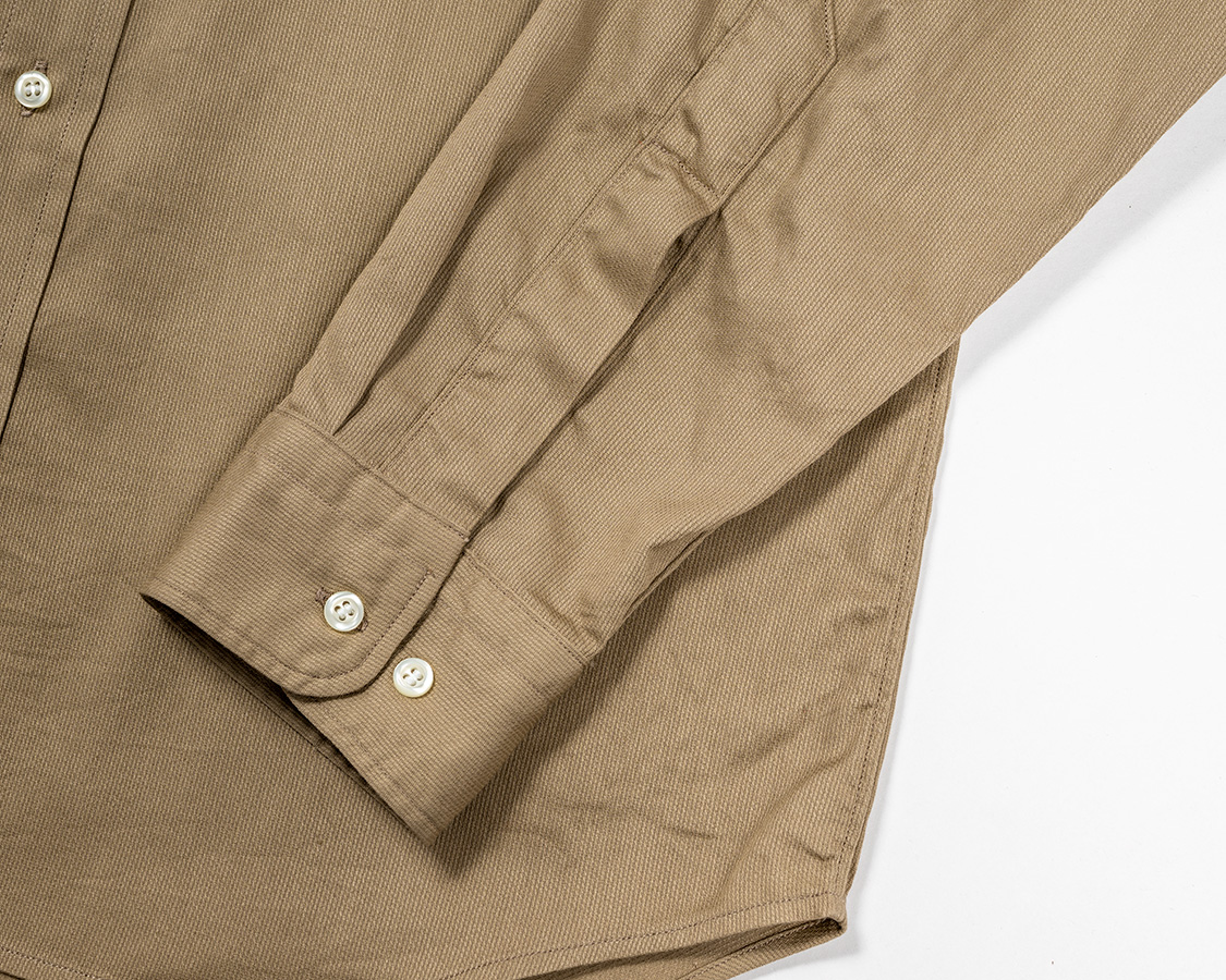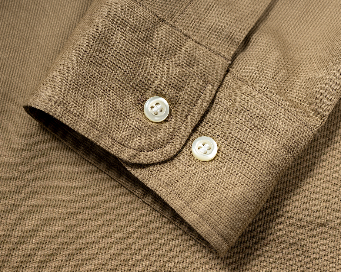 開きの裏、ぜひお手元に届いたら見てください。切りっぱなし部分がありません。これもパターン+縫いの仕様です。アメリカ物のボタンダウンでこのうまい仕様を見つけて真似た部分。作り方が気になる方は解体してみると、縫い代が独特な入り方して「難しい!」というのがわかります。 |