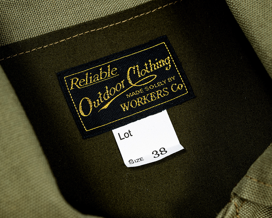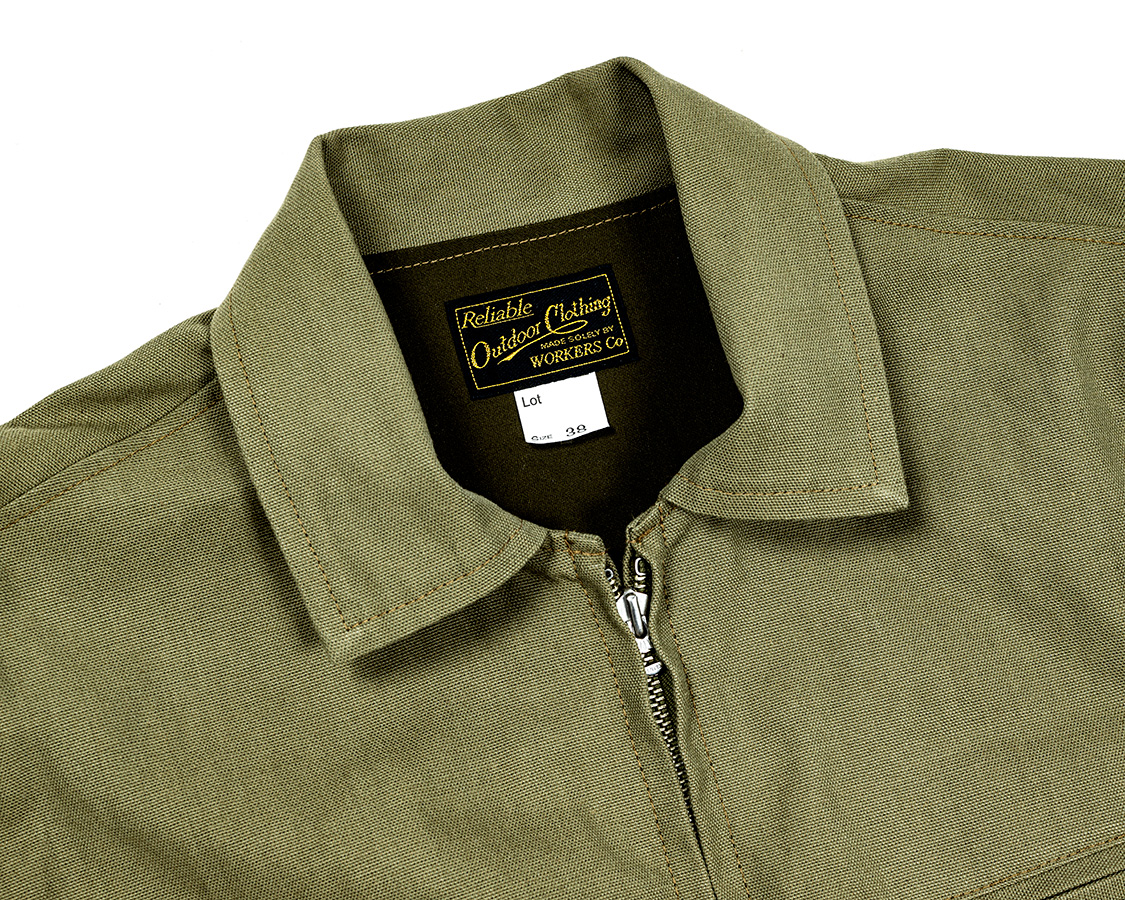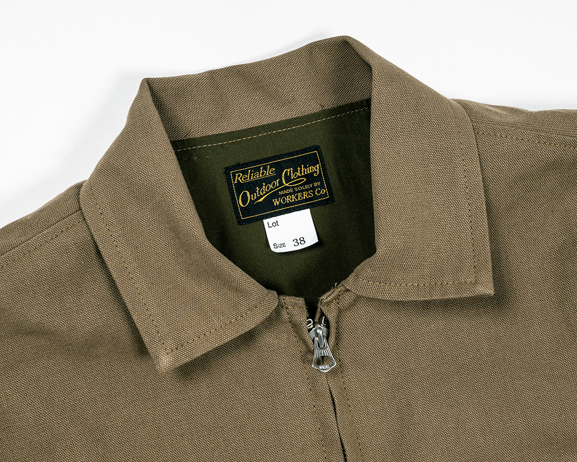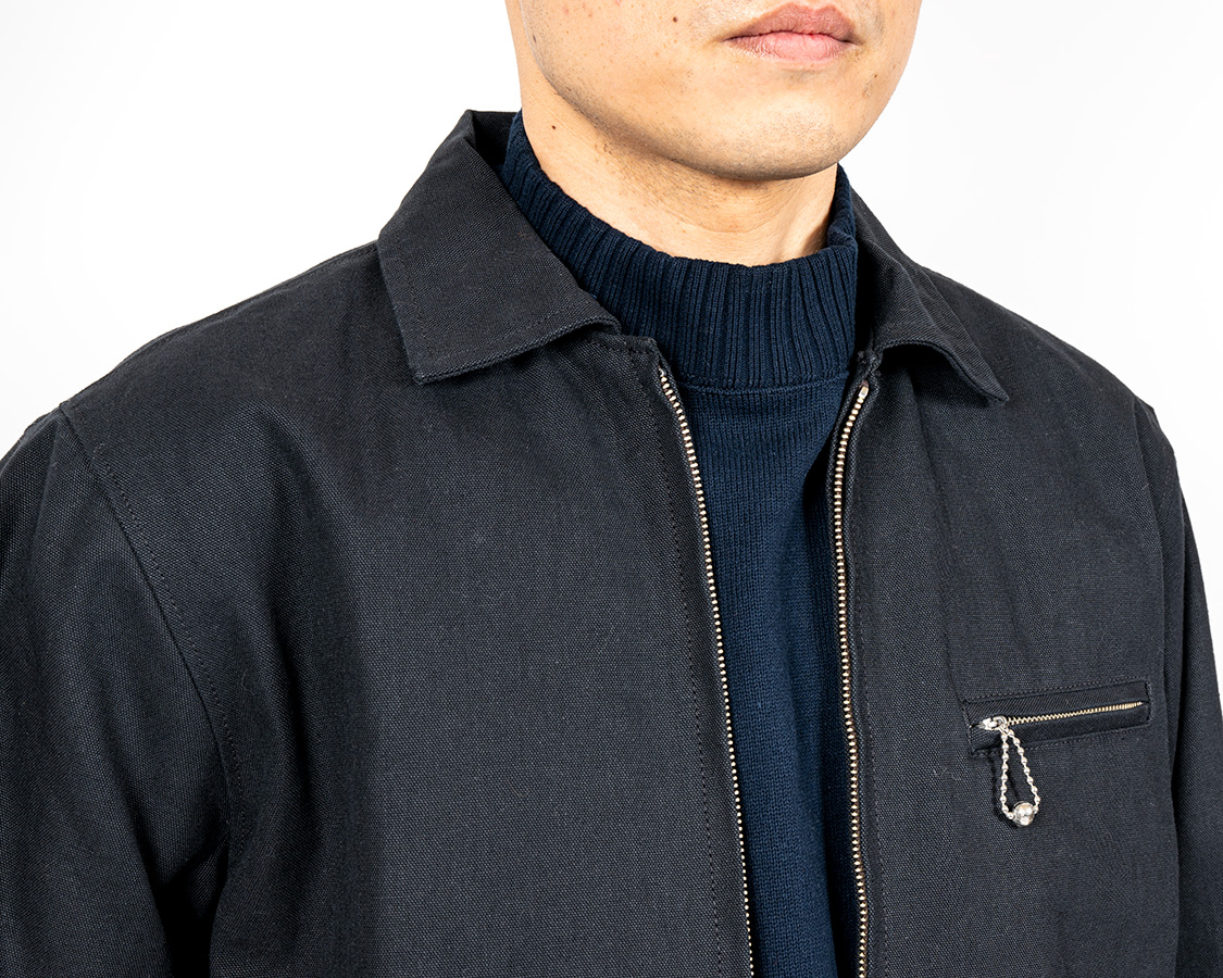 小ぶりで四角い襟。ファスナーを上まで閉めると襟が左右に開いたように見えます。ビンテージの213とか、ふる~いGジャンの襟型から想像した形。
