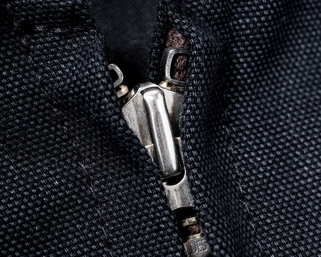 ファスナーは朝日のTALON「風」オートマチック。エンドボックスと引手が右身頃側に来る、いわゆる「アメリカ式」の差し込み位置。