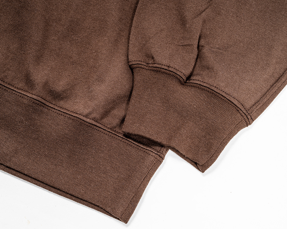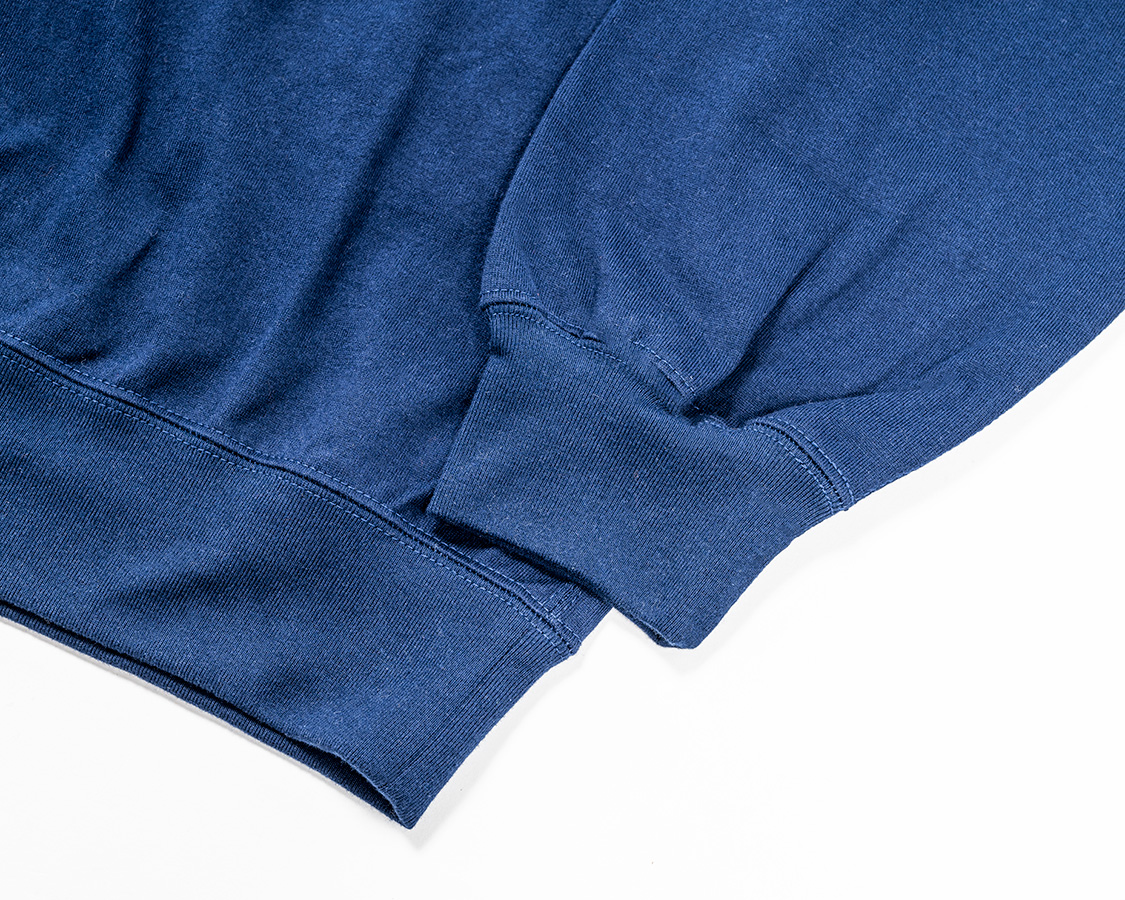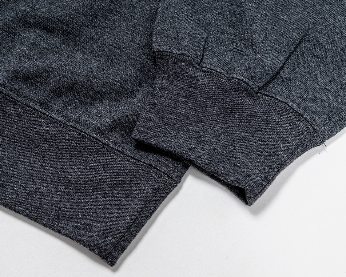 袖口リブは「きつすぎない、ゆるすぎない」寸法に調節。身頃の袖口はリブより大きいので、リブに対して伸ばしながらつける。それが、シャーリングのような皺になっています。