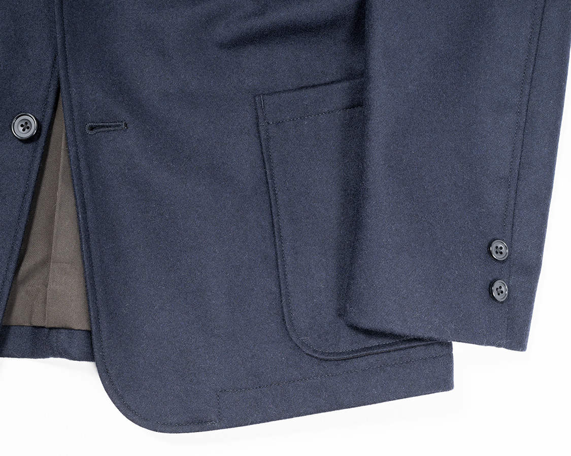 短めの着丈。カッタウェイは少なく、直線的な前端の角を落としたライン。