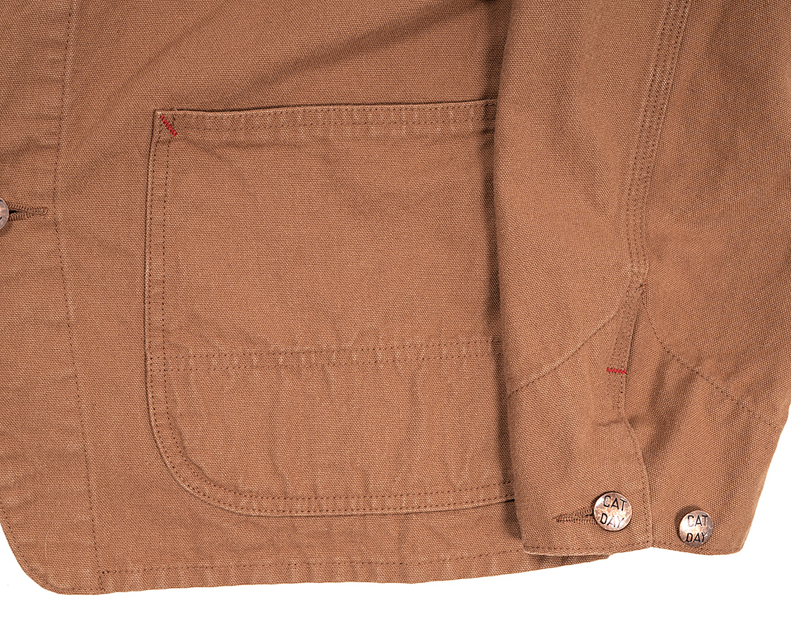 これも若かりし頃に見てもよくわからなかった始末。カフスがついているのに比べると、ある意味複雑といえば複雑。でもカバーオールというと、この見返し+調整ボタン。袖の縫い合わせの突端はカンドメで補強、が定番です。