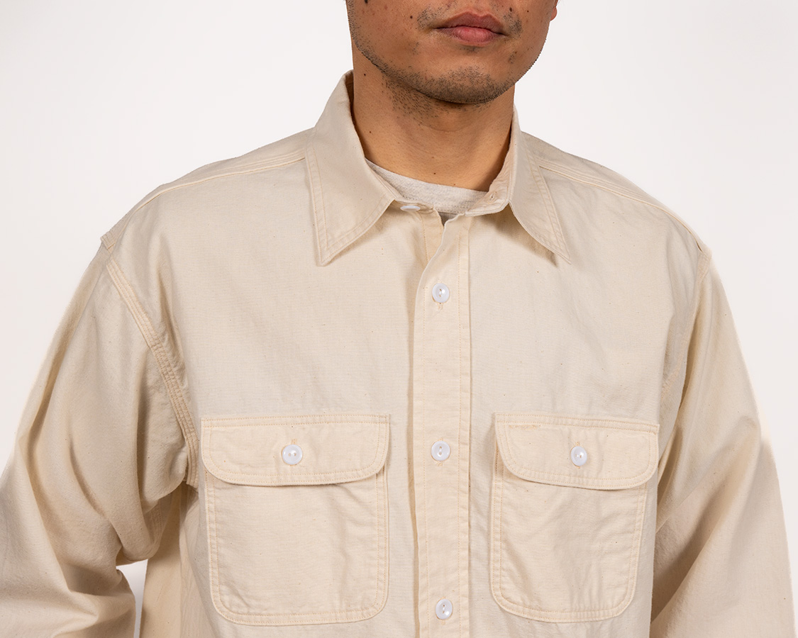 ネックは台襟+羽襟。チンストは無し。MILTON F GOODMAN Shirtのような超豪華系ではなく、もっと後の年代の「地味、でも今見ればすごくよくできている」ワークシャツを目指しています。こういうシャツも昔はそれこそ数千円から、1-2万出せばビンテージが買えましたが、今は無理なので作りました。