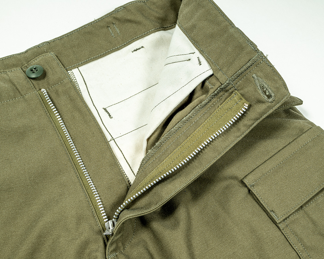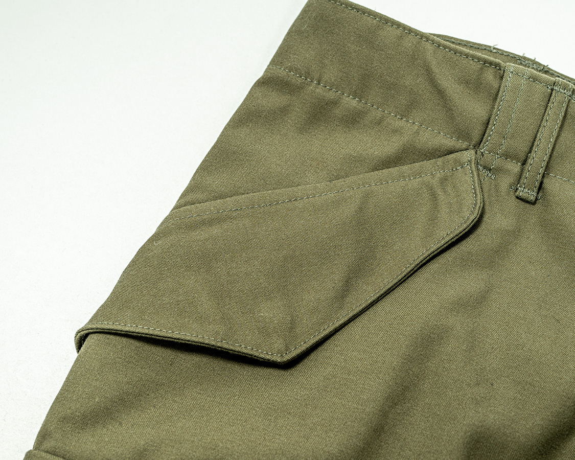 膝タック。どこまで機能的な意味があるか微妙ですが、「軍パンといえば」の仕様。縫う側としては、脇・内またを巻き縫いするときにこのタックが大変邪魔です。