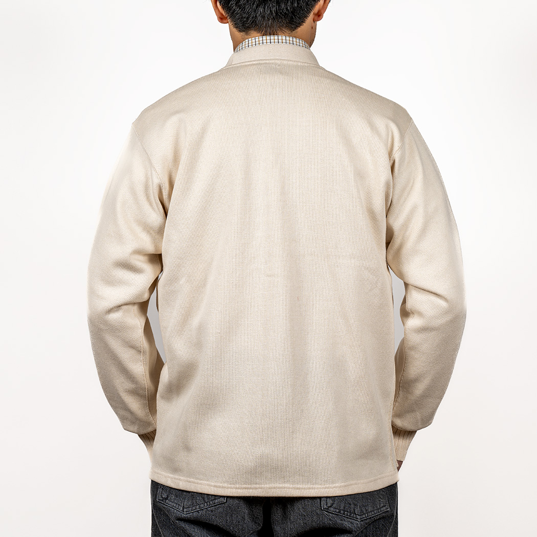 生地の編み方はT シャツと同じですが、極太糸を何本も編み針に突っ込んで編むことで、まるでローゲージセー ターのような厚み。さらに生地の裏側を起毛してよりセーターライクにしています。