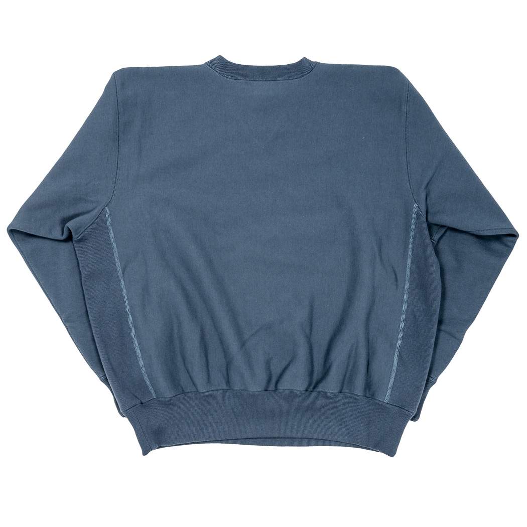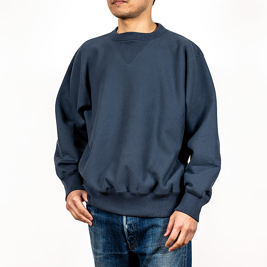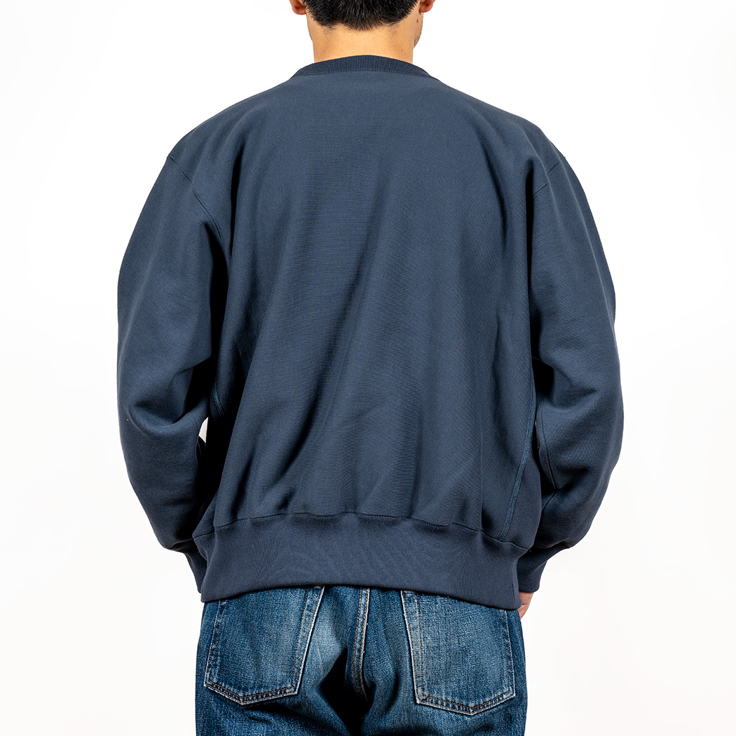 18ゲージでガチガチに目を詰めて編んでいるので形崩れしにくい。重さ15 オンス程あり、いわゆる「超ヘビーウェイトスウェット」。でも化繊は使っていないのでしなやか。